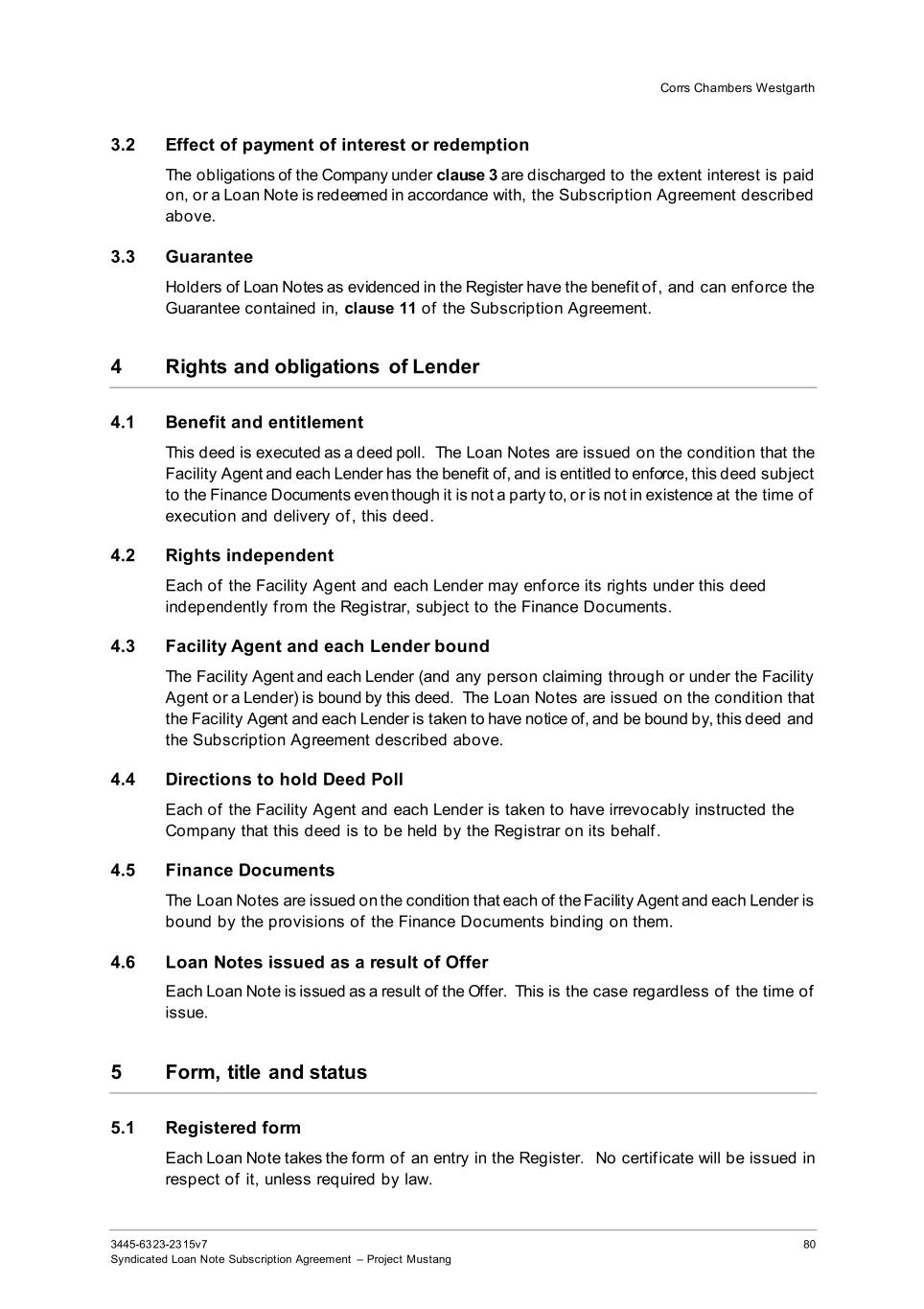 Corrs Chambers Westgarth 3445-6323-2315v7 80 Syndicated Loan Note Subscription Agreement – Project Mustang 3.2 Effect of payment of interest or redemption The obligations of the Company under clause 3 are discharged to the extent interest is paid on, or a Loan Note is redeemed in accordance with, the Subscription Agreement described above. 3.3 Guarantee Holders of Loan Notes as evidenced in the Register have the benefit of , and can enforce the Guarantee contained in, clause 11 of the Subscription Agreement. 4 Rights and obligations of Lender 4.1 Benefit and entitlement This deed is executed as a deed poll. The Loan Notes are issued on the condition that the Facility Agent and each Lender has the benefit of, and is entitled to enforce, this deed subject to the Finance Documents even though it is not a party to, or is not in existence at the time of execution and delivery of , this deed. 4.2 Rights independent Each of the Facility Agent and each Lender may enforce its rights under this deed independently f rom the Registrar, subject to the Finance Documents. 4.3 Facility Agent and each Lender bound The Facility Agent and each Lender (and any person claiming through or under the Facility Agent or a Lender) is bound by this deed. The Loan Notes are issued on the condition that the Facility Agent and each Lender is taken to have notice of, and be bound by, this deed and the Subscription Agreement described above. 4.4 Directions to hold Deed Poll Each of the Facility Agent and each Lender is taken to have irrevocably instructed the Company that this deed is to be held by the Registrar on its behalf . 4.5 Finance Documents The Loan Notes are issued on the condition that each of the Facility Agent and each Lender is bound by the provisions of the Finance Documents binding on them. 4.6 Loan Notes issued as a result of Offer Each Loan Note is issued as a result of the Offer. This is the case regardless of the time of issue. 5 Form, title and status 5.1 Registered form Each Loan Note takes the form of an entry in the Register. No certif icate will be issued in respect of it, unless required by law.