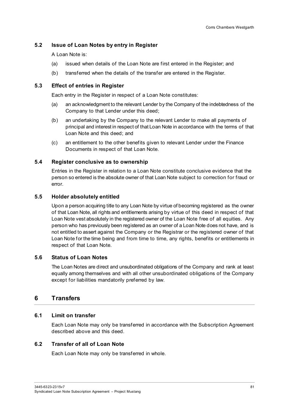 Corrs Chambers Westgarth 3445-6323-2315v7 81 Syndicated Loan Note Subscription Agreement – Project Mustang 5.2 Issue of Loan Notes by entry in Register A Loan Note is: (a) issued when details of the Loan Note are f irst entered in the Register; and (b) transferred when the details of the transfer are entered in the Register. 5.3 Effect of entries in Register Each entry in the Register in respect of a Loan Note constitutes: (a) an acknowledgment to the relevant Lender by the Company of the indebtedness of the Company to that Lender under this deed; (b) an undertaking by the Company to the relevant Lender to make all payments of principal and interest in respect of that Loan Note in accordance with the terms of that Loan Note and this deed; and (c) an entitlement to the other benef its given to relevant Lender under the Finance Documents in respect of that Loan Note. 5.4 Register conclusive as to ownership Entries in the Register in relation to a Loan Note constitute conclusive evidence that the person so entered is the absolute owner of that Loan Note subject to correction for f raud or error. 5.5 Holder absolutely entitled Upon a person acquiring title to any Loan Note by virtue of becoming registered as the owner of that Loan Note, all rights and entitlements arising by virtue of this deed in respect of that Loan Note vest absolutely in the registered owner of the Loan Note f ree of all equities. Any person who has previously been registered as an owner of a Loan Note does not have, and is not entitled to assert against the Company or the Registrar or the registered owner of that Loan Note for the time being and f rom time to time, any rights, benef its or entitlements in respect of that Loan Note. 5.6 Status of Loan Notes The Loan Notes are direct and unsubordinated obligations of the Company and rank at least equally among themselves and with all other unsubordinated obligations of the Company except for liabilities mandatorily preferred by law. 6 Transfers 6.1 Limit on transfer Each Loan Note may only be transferred in accordance with the Subscription Agreement described above and this deed. 6.2 Transfer of all of Loan Note Each Loan Note may only be transferred in whole.