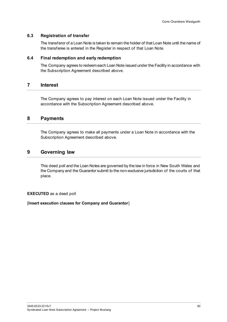 Corrs Chambers Westgarth 3445-6323-2315v7 82 Syndicated Loan Note Subscription Agreement – Project Mustang 6.3 Registration of transfer The transferor of a Loan Note is taken to remain the holder of that Loan Note until the name of the transferee is entered in the Register in respect of that Loan Note. 6.4 Final redemption and early redemption The Company agrees to redeem each Loan Note issued under the Facility in accordance with the Subscription Agreement described above. 7 Interest The Company agrees to pay interest on each Loan Note issued under the Facility in accordance with the Subscription Agreement described above. 8 Payments The Company agrees to make all payments under a Loan Note in accordance with the Subscription Agreement described above. 9 Governing law This deed poll and the Loan Notes are governed by the law in force in New South Wales and the Company and the Guarantor submit to the non-exclusive jurisdiction of the courts of that place. EXECUTED as a deed poll [Insert execution clauses for Company and Guarantor]