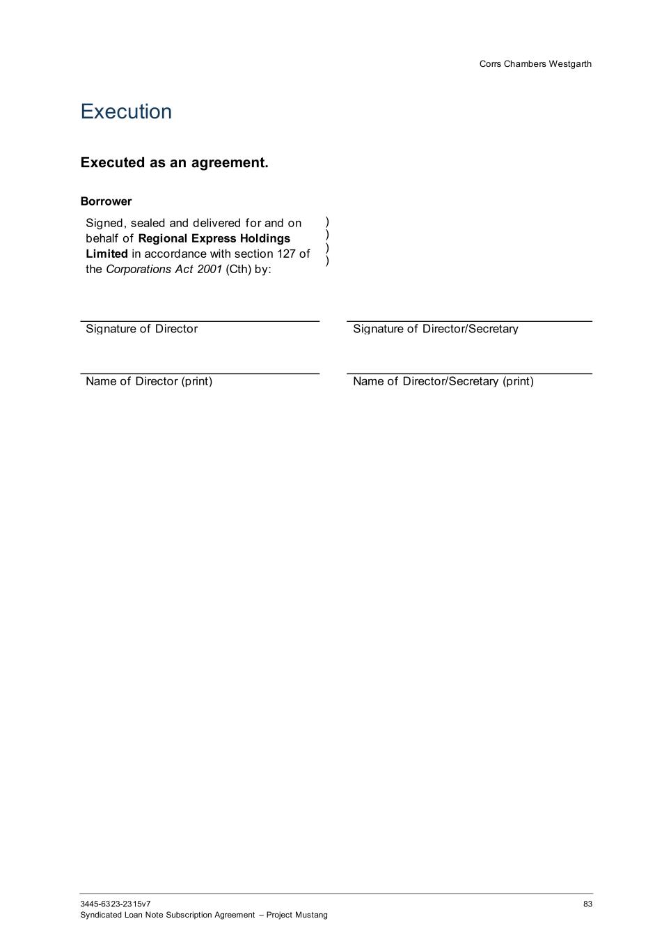 Corrs Chambers Westgarth 3445-6323-2315v7 83 Syndicated Loan Note Subscription Agreement – Project Mustang Execution Executed as an agreement. Borrower Signed, sealed and delivered for and on behalf of Regional Express Holdings Limited in accordance with section 127 of the Corporations Act 2001 (Cth) by: ) ) ) ) Signature of Director Signature of Director/Secretary Name of Director (print) Name of Director/Secretary (print)