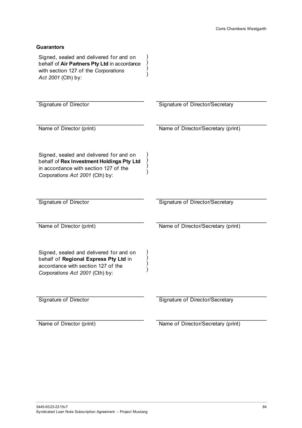 Corrs Chambers Westgarth 3445-6323-2315v7 84 Syndicated Loan Note Subscription Agreement – Project Mustang Guarantors Signed, sealed and delivered for and on behalf of Air Partners Pty Ltd in accordance with section 127 of the Corporations Act 2001 (Cth) by: ) ) ) ) Signature of Director Signature of Director/Secretary Name of Director (print) Name of Director/Secretary (print) Signed, sealed and delivered for and on behalf of Rex Investment Holdings Pty Ltd in accordance with section 127 of the Corporations Act 2001 (Cth) by: ) ) ) ) Signature of Director Signature of Director/Secretary Name of Director (print) Name of Director/Secretary (print) Signed, sealed and delivered for and on behalf of Regional Express Pty Ltd in accordance with section 127 of the Corporations Act 2001 (Cth) by: ) ) ) ) Signature of Director Signature of Director/Secretary Name of Director (print) Name of Director/Secretary (print)