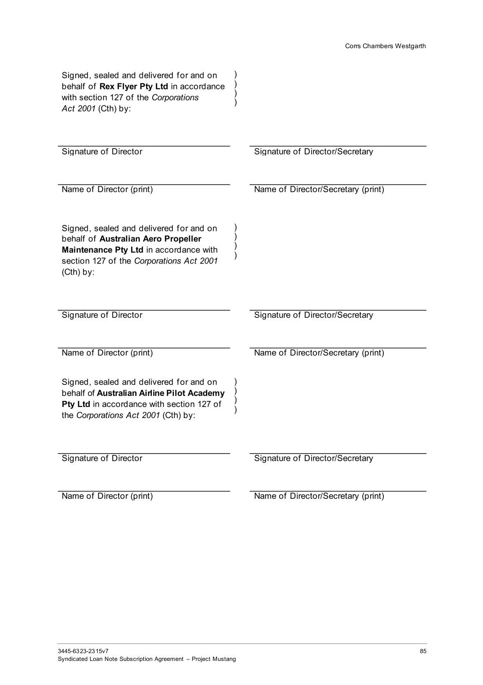 Corrs Chambers Westgarth 3445-6323-2315v7 85 Syndicated Loan Note Subscription Agreement – Project Mustang Signed, sealed and delivered for and on behalf of Rex Flyer Pty Ltd in accordance with section 127 of the Corporations Act 2001 (Cth) by: ) ) ) ) Signature of Director Signature of Director/Secretary Name of Director (print) Name of Director/Secretary (print) Signed, sealed and delivered for and on behalf of Australian Aero Propeller Maintenance Pty Ltd in accordance with section 127 of the Corporations Act 2001 (Cth) by: ) ) ) ) Signature of Director Signature of Director/Secretary Name of Director (print) Name of Director/Secretary (print) Signed, sealed and delivered for and on behalf of Australian Airline Pilot Academy Pty Ltd in accordance with section 127 of the Corporations Act 2001 (Cth) by: ) ) ) ) Signature of Director Signature of Director/Secretary Name of Director (print) Name of Director/Secretary (print)