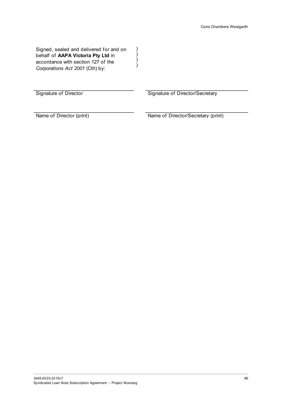 Corrs Chambers Westgarth 3445-6323-2315v7 86 Syndicated Loan Note Subscription Agreement – Project Mustang Signed, sealed and delivered for and on behalf of AAPA Victoria Pty Ltd in accordance with section 127 of the Corporations Act 2001 (Cth) by: ) ) ) ) Signature of Director Signature of Director/Secretary Name of Director (print) Name of Director/Secretary (print)