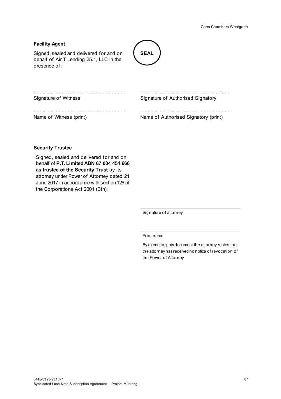 Corrs Chambers Westgarth 3445-6323-2315v7 87 Syndicated Loan Note Subscription Agreement – Project Mustang SEA L Facility Agent Signed, sealed and delivered for and on behalf of Air T Lending 25.1, LLC in the presence of : SEAL .............................................................. Signature of Witness .............................................................. Name of Witness (print) .............................................................. Signature of Authorised Signatory .............................................................. Name of Authorised Signatory (print) Security Trustee Signed, sealed and delivered for and on behalf of P.T. Limited ABN 67 004 454 666 as trustee of the Security Trust by its attorney under Power of Attorney dated 21 June 2017 in accordance with section 126 of the Corporations Act 2001 (Cth): Signature of attorney Print name By executing this document the attorney states that the attorney has received no notice of revocation of the Power of Attorney