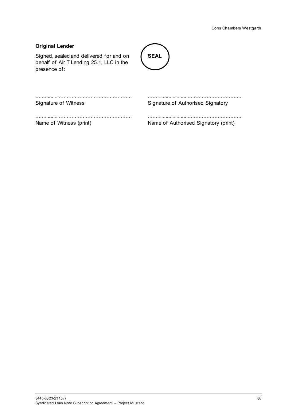 Corrs Chambers Westgarth 3445-6323-2315v7 88 Syndicated Loan Note Subscription Agreement – Project Mustang SEA L Original Lender Signed, sealed and delivered for and on behalf of Air T Lending 25.1, LLC in the presence of : SEAL .............................................................. Signature of Witness .............................................................. Name of Witness (print) .............................................................. Signature of Authorised Signatory .............................................................. Name of Authorised Signatory (print)