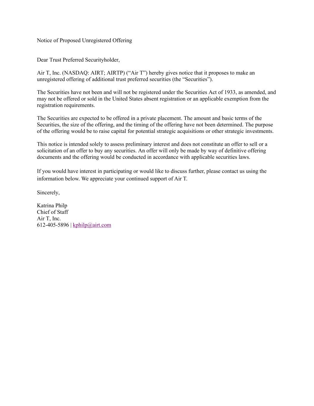 Notice of Proposed Unregistered Offering Dear Trust Preferred Securityholder, Air T, Inc. (NASDAQ: AIRT; AIRTP) (“Air T”) hereby gives notice that it proposes to make an unregistered offering of additional trust preferred securities (the “Securities”). The Securities have not been and will not be registered under the Securities Act of 1933, as amended, and may not be offered or sold in the United States absent registration or an applicable exemption from the registration requirements. The Securities are expected to be offered in a private placement. The amount and basic terms of the Securities, the size of the offering, and the timing of the offering have not been determined. The purpose of the offering would be to raise capital for potential strategic acquisitions or other strategic investments. This notice is intended solely to assess preliminary interest and does not constitute an offer to sell or a solicitation of an offer to buy any securities. An offer will only be made by way of definitive offering documents and the offering would be conducted in accordance with applicable securities laws. If you would have interest in participating or would like to discuss further, please contact us using the information below. We appreciate your continued support of Air T. Sincerely, Katrina Philp Chief of Staff Air T, Inc. 612-405-5896 | kphilp@airt.com