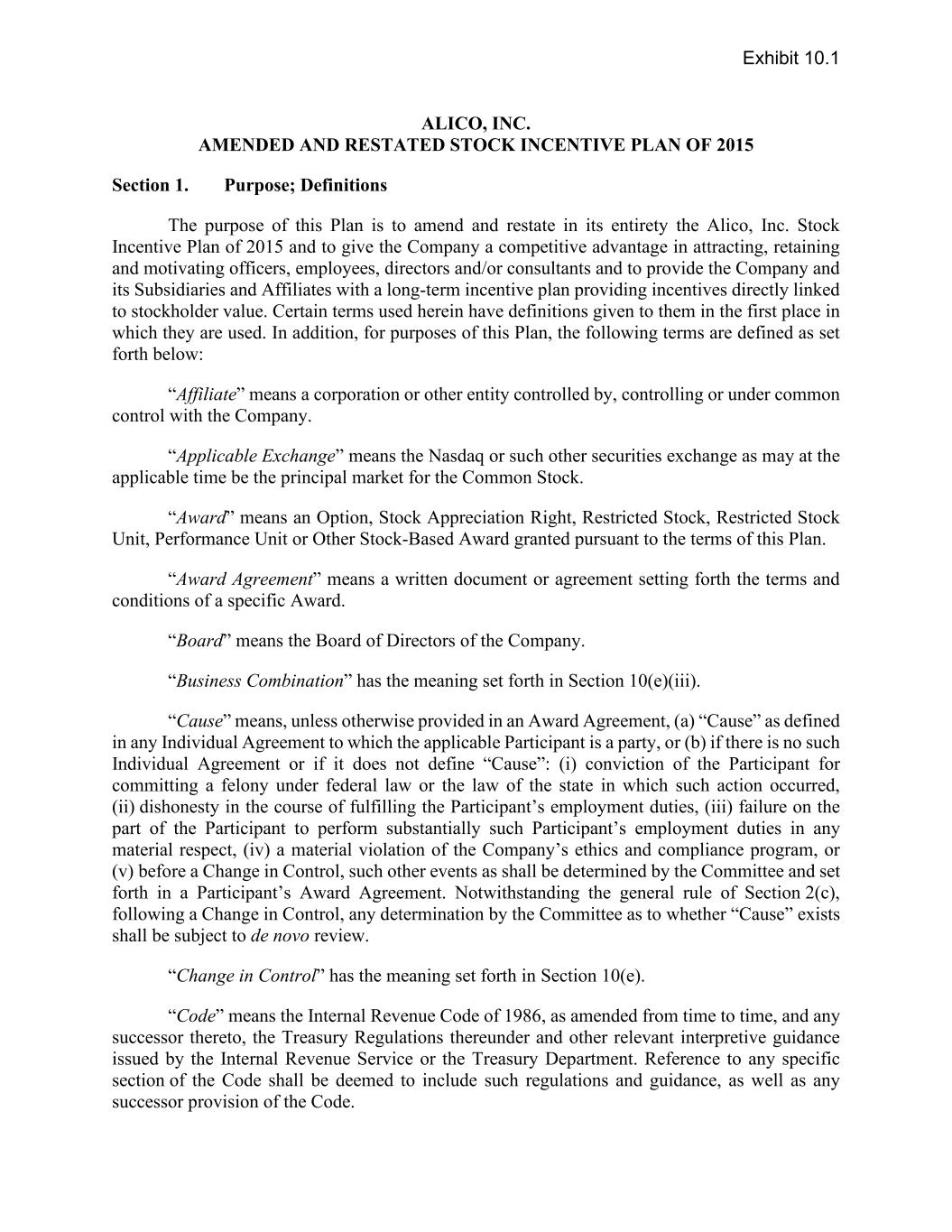 ALICO, INC. AMENDED AND RESTATED STOCK INCENTIVE PLAN OF 2015 Section 1. Purpose; Definitions The purpose of this Plan is to amend and restate in its entirety the Alico, Inc. Stock Incentive Plan of 2015 and to give the Company a competitive advantage in attracting, retaining and motivating officers, employees, directors and/or consultants and to provide the Company and its Subsidiaries and Affiliates with a long-term incentive plan providing incentives directly linked to stockholder value. Certain terms used herein have definitions given to them in the first place in which they are used. In addition, for purposes of this Plan, the following terms are defined as set forth below: “Affiliate” means a corporation or other entity controlled by, controlling or under common control with the Company. “Applicable Exchange” means the Nasdaq or such other securities exchange as may at the applicable time be the principal market for the Common Stock. “Award” means an Option, Stock Appreciation Right, Restricted Stock, Restricted Stock Unit, Performance Unit or Other Stock-Based Award granted pursuant to the terms of this Plan. “Award Agreement” means a written document or agreement setting forth the terms and conditions of a specific Award. “Board” means the Board of Directors of the Company. “Business Combination” has the meaning set forth in Section 10(e)(iii). “Cause” means, unless otherwise provided in an Award Agreement, (a) “Cause” as defined in any Individual Agreement to which the applicable Participant is a party, or (b) if there is no such Individual Agreement or if it does not define “Cause”: (i) conviction of the Participant for committing a felony under federal law or the law of the state in which such action occurred, (ii) dishonesty in the course of fulfilling the Participant’s employment duties, (iii) failure on the part of the Participant to perform substantially such Participant’s employment duties in any material respect, (iv) a material violation of the Company’s ethics and compliance program, or (v) before a Change in Control, such other events as shall be determined by the Committee and set forth in a Participant’s Award Agreement. Notwithstanding the general rule of Section 2(c), following a Change in Control, any determination by the Committee as to whether “Cause” exists shall be subject to de novo review. “Change in Control” has the meaning set forth in Section 10(e). “Code” means the Internal Revenue Code of 1986, as amended from time to time, and any successor thereto, the Treasury Regulations thereunder and other relevant interpretive guidance issued by the Internal Revenue Service or the Treasury Department. Reference to any specific section of the Code shall be deemed to include such regulations and guidance, as well as any successor provision of the Code. Exhibit 10.1