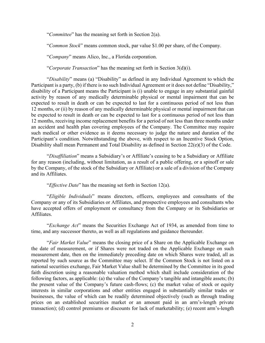 2 “Committee” has the meaning set forth in Section 2(a). “Common Stock” means common stock, par value $1.00 per share, of the Company. “Company” means Alico, Inc., a Florida corporation. “Corporate Transaction” has the meaning set forth in Section 3(d)(i). “Disability” means (a) “Disability” as defined in any Individual Agreement to which the Participant is a party, (b) if there is no such Individual Agreement or it does not define “Disability,” disability of a Participant means the Participant is (i) unable to engage in any substantial gainful activity by reason of any medically determinable physical or mental impairment that can be expected to result in death or can be expected to last for a continuous period of not less than 12 months, or (ii) by reason of any medically determinable physical or mental impairment that can be expected to result in death or can be expected to last for a continuous period of not less than 12 months, receiving income replacement benefits for a period of not less than three months under an accident and health plan covering employees of the Company. The Committee may require such medical or other evidence as it deems necessary to judge the nature and duration of the Participant’s condition. Notwithstanding the above, with respect to an Incentive Stock Option, Disability shall mean Permanent and Total Disability as defined in Section 22(e)(3) of the Code. “Disaffiliation” means a Subsidiary’s or Affiliate’s ceasing to be a Subsidiary or Affiliate for any reason (including, without limitation, as a result of a public offering, or a spinoff or sale by the Company, of the stock of the Subsidiary or Affiliate) or a sale of a division of the Company and its Affiliates. “Effective Date” has the meaning set forth in Section 12(a). “Eligible Individuals” means directors, officers, employees and consultants of the Company or any of its Subsidiaries or Affiliates, and prospective employees and consultants who have accepted offers of employment or consultancy from the Company or its Subsidiaries or Affiliates. “Exchange Act” means the Securities Exchange Act of 1934, as amended from time to time, and any successor thereto, as well as all regulations and guidance thereunder. “Fair Market Value” means the closing price of a Share on the Applicable Exchange on the date of measurement, or if Shares were not traded on the Applicable Exchange on such measurement date, then on the immediately preceding date on which Shares were traded, all as reported by such source as the Committee may select. If the Common Stock is not listed on a national securities exchange, Fair Market Value shall be determined by the Committee in its good faith discretion using a reasonable valuation method which shall include consideration of the following factors, as applicable: (a) the value of the Company’s tangible and intangible assets; (b) the present value of the Company’s future cash-flows; (c) the market value of stock or equity interests in similar corporations and other entities engaged in substantially similar trades or businesses, the value of which can be readily determined objectively (such as through trading prices on an established securities market or an amount paid in an arm’s-length private transaction); (d) control premiums or discounts for lack of marketability; (e) recent arm’s-length