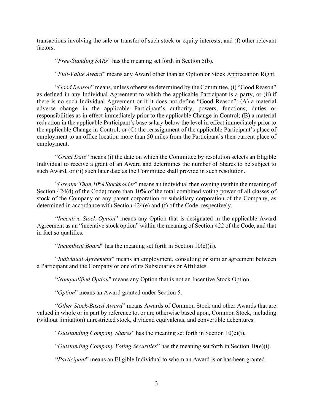 3 transactions involving the sale or transfer of such stock or equity interests; and (f) other relevant factors. “Free-Standing SARs” has the meaning set forth in Section 5(b). “Full-Value Award” means any Award other than an Option or Stock Appreciation Right. “Good Reason” means, unless otherwise determined by the Committee, (i) “Good Reason” as defined in any Individual Agreement to which the applicable Participant is a party, or (ii) if there is no such Individual Agreement or if it does not define “Good Reason”: (A) a material adverse change in the applicable Participant’s authority, powers, functions, duties or responsibilities as in effect immediately prior to the applicable Change in Control; (B) a material reduction in the applicable Participant’s base salary below the level in effect immediately prior to the applicable Change in Control; or (C) the reassignment of the applicable Participant’s place of employment to an office location more than 50 miles from the Participant’s then-current place of employment. “Grant Date” means (i) the date on which the Committee by resolution selects an Eligible Individual to receive a grant of an Award and determines the number of Shares to be subject to such Award, or (ii) such later date as the Committee shall provide in such resolution. “Greater Than 10% Stockholder” means an individual then owning (within the meaning of Section 424(d) of the Code) more than 10% of the total combined voting power of all classes of stock of the Company or any parent corporation or subsidiary corporation of the Company, as determined in accordance with Section 424(e) and (f) of the Code, respectively. “Incentive Stock Option” means any Option that is designated in the applicable Award Agreement as an “incentive stock option” within the meaning of Section 422 of the Code, and that in fact so qualifies. “Incumbent Board” has the meaning set forth in Section 10(e)(ii). “Individual Agreement” means an employment, consulting or similar agreement between a Participant and the Company or one of its Subsidiaries or Affiliates. “Nonqualified Option” means any Option that is not an Incentive Stock Option. “Option” means an Award granted under Section 5. “Other Stock-Based Award” means Awards of Common Stock and other Awards that are valued in whole or in part by reference to, or are otherwise based upon, Common Stock, including (without limitation) unrestricted stock, dividend equivalents, and convertible debentures. “Outstanding Company Shares” has the meaning set forth in Section 10(e)(i). “Outstanding Company Voting Securities” has the meaning set forth in Section 10(e)(i). “Participant” means an Eligible Individual to whom an Award is or has been granted.