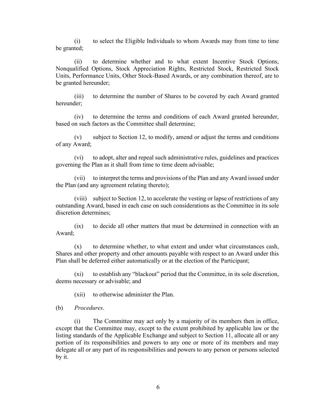 6 (i) to select the Eligible Individuals to whom Awards may from time to time be granted; (ii) to determine whether and to what extent Incentive Stock Options, Nonqualified Options, Stock Appreciation Rights, Restricted Stock, Restricted Stock Units, Performance Units, Other Stock-Based Awards, or any combination thereof, are to be granted hereunder; (iii) to determine the number of Shares to be covered by each Award granted hereunder; (iv) to determine the terms and conditions of each Award granted hereunder, based on such factors as the Committee shall determine; (v) subject to Section 12, to modify, amend or adjust the terms and conditions of any Award; (vi) to adopt, alter and repeal such administrative rules, guidelines and practices governing the Plan as it shall from time to time deem advisable; (vii) to interpret the terms and provisions of the Plan and any Award issued under the Plan (and any agreement relating thereto); (viii) subject to Section 12, to accelerate the vesting or lapse of restrictions of any outstanding Award, based in each case on such considerations as the Committee in its sole discretion determines; (ix) to decide all other matters that must be determined in connection with an Award; (x) to determine whether, to what extent and under what circumstances cash, Shares and other property and other amounts payable with respect to an Award under this Plan shall be deferred either automatically or at the election of the Participant; (xi) to establish any “blackout” period that the Committee, in its sole discretion, deems necessary or advisable; and (xii) to otherwise administer the Plan. (b) Procedures. (i) The Committee may act only by a majority of its members then in office, except that the Committee may, except to the extent prohibited by applicable law or the listing standards of the Applicable Exchange and subject to Section 11, allocate all or any portion of its responsibilities and powers to any one or more of its members and may delegate all or any part of its responsibilities and powers to any person or persons selected by it.