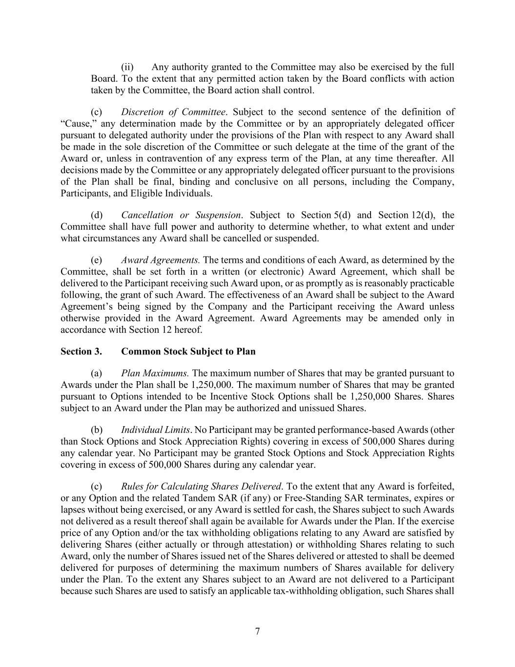7 (ii) Any authority granted to the Committee may also be exercised by the full Board. To the extent that any permitted action taken by the Board conflicts with action taken by the Committee, the Board action shall control. (c) Discretion of Committee. Subject to the second sentence of the definition of “Cause,” any determination made by the Committee or by an appropriately delegated officer pursuant to delegated authority under the provisions of the Plan with respect to any Award shall be made in the sole discretion of the Committee or such delegate at the time of the grant of the Award or, unless in contravention of any express term of the Plan, at any time thereafter. All decisions made by the Committee or any appropriately delegated officer pursuant to the provisions of the Plan shall be final, binding and conclusive on all persons, including the Company, Participants, and Eligible Individuals. (d) Cancellation or Suspension. Subject to Section 5(d) and Section 12(d), the Committee shall have full power and authority to determine whether, to what extent and under what circumstances any Award shall be cancelled or suspended. (e) Award Agreements. The terms and conditions of each Award, as determined by the Committee, shall be set forth in a written (or electronic) Award Agreement, which shall be delivered to the Participant receiving such Award upon, or as promptly as is reasonably practicable following, the grant of such Award. The effectiveness of an Award shall be subject to the Award Agreement’s being signed by the Company and the Participant receiving the Award unless otherwise provided in the Award Agreement. Award Agreements may be amended only in accordance with Section 12 hereof. Section 3. Common Stock Subject to Plan (a) Plan Maximums. The maximum number of Shares that may be granted pursuant to Awards under the Plan shall be 1,250,000. The maximum number of Shares that may be granted pursuant to Options intended to be Incentive Stock Options shall be 1,250,000 Shares. Shares subject to an Award under the Plan may be authorized and unissued Shares. (b) Individual Limits. No Participant may be granted performance-based Awards (other than Stock Options and Stock Appreciation Rights) covering in excess of 500,000 Shares during any calendar year. No Participant may be granted Stock Options and Stock Appreciation Rights covering in excess of 500,000 Shares during any calendar year. (c) Rules for Calculating Shares Delivered. To the extent that any Award is forfeited, or any Option and the related Tandem SAR (if any) or Free-Standing SAR terminates, expires or lapses without being exercised, or any Award is settled for cash, the Shares subject to such Awards not delivered as a result thereof shall again be available for Awards under the Plan. If the exercise price of any Option and/or the tax withholding obligations relating to any Award are satisfied by delivering Shares (either actually or through attestation) or withholding Shares relating to such Award, only the number of Shares issued net of the Shares delivered or attested to shall be deemed delivered for purposes of determining the maximum numbers of Shares available for delivery under the Plan. To the extent any Shares subject to an Award are not delivered to a Participant because such Shares are used to satisfy an applicable tax-withholding obligation, such Shares shall