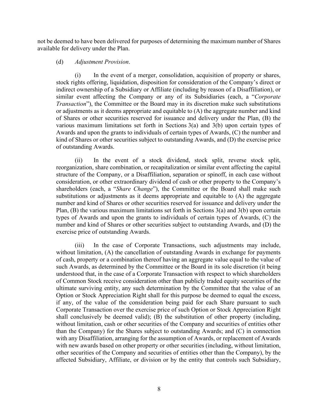 8 not be deemed to have been delivered for purposes of determining the maximum number of Shares available for delivery under the Plan. (d) Adjustment Provision. (i) In the event of a merger, consolidation, acquisition of property or shares, stock rights offering, liquidation, disposition for consideration of the Company’s direct or indirect ownership of a Subsidiary or Affiliate (including by reason of a Disaffiliation), or similar event affecting the Company or any of its Subsidiaries (each, a “Corporate Transaction”), the Committee or the Board may in its discretion make such substitutions or adjustments as it deems appropriate and equitable to (A) the aggregate number and kind of Shares or other securities reserved for issuance and delivery under the Plan, (B) the various maximum limitations set forth in Sections 3(a) and 3(b) upon certain types of Awards and upon the grants to individuals of certain types of Awards, (C) the number and kind of Shares or other securities subject to outstanding Awards, and (D) the exercise price of outstanding Awards. (ii) In the event of a stock dividend, stock split, reverse stock split, reorganization, share combination, or recapitalization or similar event affecting the capital structure of the Company, or a Disaffiliation, separation or spinoff, in each case without consideration, or other extraordinary dividend of cash or other property to the Company’s shareholders (each, a “Share Change”), the Committee or the Board shall make such substitutions or adjustments as it deems appropriate and equitable to (A) the aggregate number and kind of Shares or other securities reserved for issuance and delivery under the Plan, (B) the various maximum limitations set forth in Sections 3(a) and 3(b) upon certain types of Awards and upon the grants to individuals of certain types of Awards, (C) the number and kind of Shares or other securities subject to outstanding Awards, and (D) the exercise price of outstanding Awards. (iii) In the case of Corporate Transactions, such adjustments may include, without limitation, (A) the cancellation of outstanding Awards in exchange for payments of cash, property or a combination thereof having an aggregate value equal to the value of such Awards, as determined by the Committee or the Board in its sole discretion (it being understood that, in the case of a Corporate Transaction with respect to which shareholders of Common Stock receive consideration other than publicly traded equity securities of the ultimate surviving entity, any such determination by the Committee that the value of an Option or Stock Appreciation Right shall for this purpose be deemed to equal the excess, if any, of the value of the consideration being paid for each Share pursuant to such Corporate Transaction over the exercise price of such Option or Stock Appreciation Right shall conclusively be deemed valid); (B) the substitution of other property (including, without limitation, cash or other securities of the Company and securities of entities other than the Company) for the Shares subject to outstanding Awards; and (C) in connection with any Disaffiliation, arranging for the assumption of Awards, or replacement of Awards with new awards based on other property or other securities (including, without limitation, other securities of the Company and securities of entities other than the Company), by the affected Subsidiary, Affiliate, or division or by the entity that controls such Subsidiary,