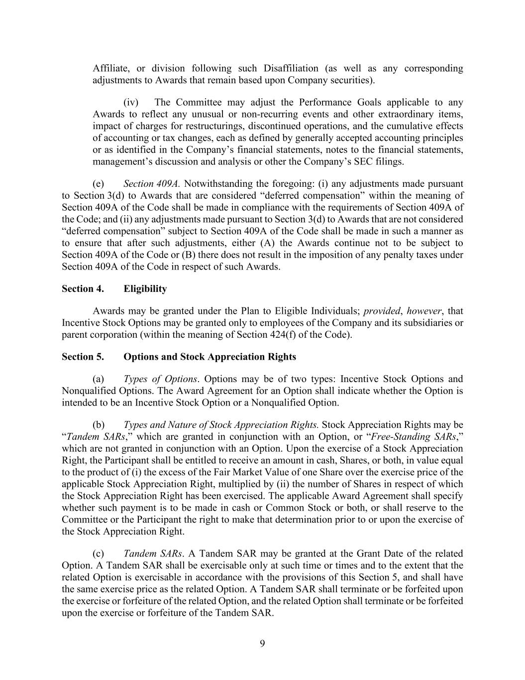 9 Affiliate, or division following such Disaffiliation (as well as any corresponding adjustments to Awards that remain based upon Company securities). (iv) The Committee may adjust the Performance Goals applicable to any Awards to reflect any unusual or non-recurring events and other extraordinary items, impact of charges for restructurings, discontinued operations, and the cumulative effects of accounting or tax changes, each as defined by generally accepted accounting principles or as identified in the Company’s financial statements, notes to the financial statements, management’s discussion and analysis or other the Company’s SEC filings. (e) Section 409A. Notwithstanding the foregoing: (i) any adjustments made pursuant to Section 3(d) to Awards that are considered “deferred compensation” within the meaning of Section 409A of the Code shall be made in compliance with the requirements of Section 409A of the Code; and (ii) any adjustments made pursuant to Section 3(d) to Awards that are not considered “deferred compensation” subject to Section 409A of the Code shall be made in such a manner as to ensure that after such adjustments, either (A) the Awards continue not to be subject to Section 409A of the Code or (B) there does not result in the imposition of any penalty taxes under Section 409A of the Code in respect of such Awards. Section 4. Eligibility Awards may be granted under the Plan to Eligible Individuals; provided, however, that Incentive Stock Options may be granted only to employees of the Company and its subsidiaries or parent corporation (within the meaning of Section 424(f) of the Code). Section 5. Options and Stock Appreciation Rights (a) Types of Options. Options may be of two types: Incentive Stock Options and Nonqualified Options. The Award Agreement for an Option shall indicate whether the Option is intended to be an Incentive Stock Option or a Nonqualified Option. (b) Types and Nature of Stock Appreciation Rights. Stock Appreciation Rights may be “Tandem SARs,” which are granted in conjunction with an Option, or “Free-Standing SARs,” which are not granted in conjunction with an Option. Upon the exercise of a Stock Appreciation Right, the Participant shall be entitled to receive an amount in cash, Shares, or both, in value equal to the product of (i) the excess of the Fair Market Value of one Share over the exercise price of the applicable Stock Appreciation Right, multiplied by (ii) the number of Shares in respect of which the Stock Appreciation Right has been exercised. The applicable Award Agreement shall specify whether such payment is to be made in cash or Common Stock or both, or shall reserve to the Committee or the Participant the right to make that determination prior to or upon the exercise of the Stock Appreciation Right. (c) Tandem SARs. A Tandem SAR may be granted at the Grant Date of the related Option. A Tandem SAR shall be exercisable only at such time or times and to the extent that the related Option is exercisable in accordance with the provisions of this Section 5, and shall have the same exercise price as the related Option. A Tandem SAR shall terminate or be forfeited upon the exercise or forfeiture of the related Option, and the related Option shall terminate or be forfeited upon the exercise or forfeiture of the Tandem SAR.