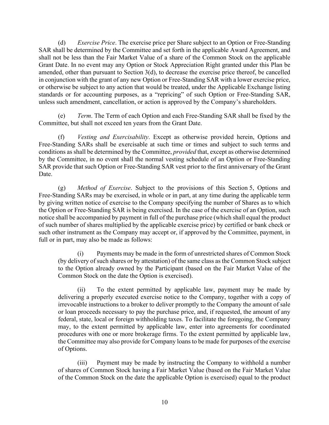 10 (d) Exercise Price. The exercise price per Share subject to an Option or Free-Standing SAR shall be determined by the Committee and set forth in the applicable Award Agreement, and shall not be less than the Fair Market Value of a share of the Common Stock on the applicable Grant Date. In no event may any Option or Stock Appreciation Right granted under this Plan be amended, other than pursuant to Section 3(d), to decrease the exercise price thereof, be cancelled in conjunction with the grant of any new Option or Free-Standing SAR with a lower exercise price, or otherwise be subject to any action that would be treated, under the Applicable Exchange listing standards or for accounting purposes, as a “repricing” of such Option or Free-Standing SAR, unless such amendment, cancellation, or action is approved by the Company’s shareholders. (e) Term. The Term of each Option and each Free-Standing SAR shall be fixed by the Committee, but shall not exceed ten years from the Grant Date. (f) Vesting and Exercisability. Except as otherwise provided herein, Options and Free-Standing SARs shall be exercisable at such time or times and subject to such terms and conditions as shall be determined by the Committee, provided that, except as otherwise determined by the Committee, in no event shall the normal vesting schedule of an Option or Free-Standing SAR provide that such Option or Free-Standing SAR vest prior to the first anniversary of the Grant Date. (g) Method of Exercise. Subject to the provisions of this Section 5, Options and Free-Standing SARs may be exercised, in whole or in part, at any time during the applicable term by giving written notice of exercise to the Company specifying the number of Shares as to which the Option or Free-Standing SAR is being exercised. In the case of the exercise of an Option, such notice shall be accompanied by payment in full of the purchase price (which shall equal the product of such number of shares multiplied by the applicable exercise price) by certified or bank check or such other instrument as the Company may accept or, if approved by the Committee, payment, in full or in part, may also be made as follows: (i) Payments may be made in the form of unrestricted shares of Common Stock (by delivery of such shares or by attestation) of the same class as the Common Stock subject to the Option already owned by the Participant (based on the Fair Market Value of the Common Stock on the date the Option is exercised). (ii) To the extent permitted by applicable law, payment may be made by delivering a properly executed exercise notice to the Company, together with a copy of irrevocable instructions to a broker to deliver promptly to the Company the amount of sale or loan proceeds necessary to pay the purchase price, and, if requested, the amount of any federal, state, local or foreign withholding taxes. To facilitate the foregoing, the Company may, to the extent permitted by applicable law, enter into agreements for coordinated procedures with one or more brokerage firms. To the extent permitted by applicable law, the Committee may also provide for Company loans to be made for purposes of the exercise of Options. (iii) Payment may be made by instructing the Company to withhold a number of shares of Common Stock having a Fair Market Value (based on the Fair Market Value of the Common Stock on the date the applicable Option is exercised) equal to the product