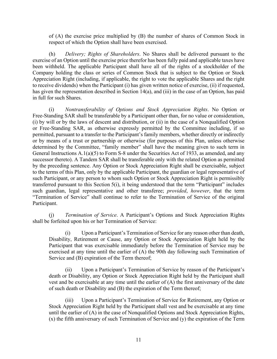 11 of (A) the exercise price multiplied by (B) the number of shares of Common Stock in respect of which the Option shall have been exercised. (h) Delivery; Rights of Shareholders. No Shares shall be delivered pursuant to the exercise of an Option until the exercise price therefor has been fully paid and applicable taxes have been withheld. The applicable Participant shall have all of the rights of a stockholder of the Company holding the class or series of Common Stock that is subject to the Option or Stock Appreciation Right (including, if applicable, the right to vote the applicable Shares and the right to receive dividends) when the Participant (i) has given written notice of exercise, (ii) if requested, has given the representation described in Section 14(a), and (iii) in the case of an Option, has paid in full for such Shares. (i) Nontransferability of Options and Stock Appreciation Rights. No Option or Free-Standing SAR shall be transferable by a Participant other than, for no value or consideration, (i) by will or by the laws of descent and distribution, or (ii) in the case of a Nonqualified Option or Free-Standing SAR, as otherwise expressly permitted by the Committee including, if so permitted, pursuant to a transfer to the Participant’s family members, whether directly or indirectly or by means of a trust or partnership or otherwise (for purposes of this Plan, unless otherwise determined by the Committee, “family member” shall have the meaning given to such term in General Instructions A.1(a)(5) to Form S-8 under the Securities Act of 1933, as amended, and any successor thereto). A Tandem SAR shall be transferable only with the related Option as permitted by the preceding sentence. Any Option or Stock Appreciation Right shall be exercisable, subject to the terms of this Plan, only by the applicable Participant, the guardian or legal representative of such Participant, or any person to whom such Option or Stock Appreciation Right is permissibly transferred pursuant to this Section 5(i), it being understood that the term “Participant” includes such guardian, legal representative and other transferee; provided, however, that the term “Termination of Service” shall continue to refer to the Termination of Service of the original Participant. (j) Termination of Service. A Participant’s Options and Stock Appreciation Rights shall be forfeited upon his or her Termination of Service: (i) Upon a Participant’s Termination of Service for any reason other than death, Disability, Retirement or Cause, any Option or Stock Appreciation Right held by the Participant that was exercisable immediately before the Termination of Service may be exercised at any time until the earlier of (A) the 90th day following such Termination of Service and (B) expiration of the Term thereof; (ii) Upon a Participant’s Termination of Service by reason of the Participant’s death or Disability, any Option or Stock Appreciation Right held by the Participant shall vest and be exercisable at any time until the earlier of (A) the first anniversary of the date of such death or Disability and (B) the expiration of the Term thereof; (iii) Upon a Participant’s Termination of Service for Retirement, any Option or Stock Appreciation Right held by the Participant shall vest and be exercisable at any time until the earlier of (A) in the case of Nonqualified Options and Stock Appreciation Rights, (x) the fifth anniversary of such Termination of Service and (y) the expiration of the Term