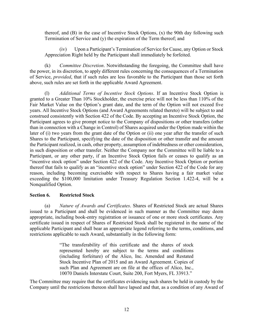 12 thereof, and (B) in the case of Incentive Stock Options, (x) the 90th day following such Termination of Service and (y) the expiration of the Term thereof; and (iv) Upon a Participant’s Termination of Service for Cause, any Option or Stock Appreciation Right held by the Participant shall immediately be forfeited. (k) Committee Discretion. Notwithstanding the foregoing, the Committee shall have the power, in its discretion, to apply different rules concerning the consequences of a Termination of Service, provided, that if such rules are less favorable to the Participant than those set forth above, such rules are set forth in the applicable Award Agreement. (l) Additional Terms of Incentive Stock Options. If an Incentive Stock Option is granted to a Greater Than 10% Stockholder, the exercise price will not be less than 110% of the Fair Market Value on the Option’s grant date, and the term of the Option will not exceed five years. All Incentive Stock Options (and Award Agreements related thereto) will be subject to and construed consistently with Section 422 of the Code. By accepting an Incentive Stock Option, the Participant agrees to give prompt notice to the Company of dispositions or other transfers (other than in connection with a Change in Control) of Shares acquired under the Option made within the later of (i) two years from the grant date of the Option or (ii) one year after the transfer of such Shares to the Participant, specifying the date of the disposition or other transfer and the amount the Participant realized, in cash, other property, assumption of indebtedness or other consideration, in such disposition or other transfer. Neither the Company nor the Committee will be liable to a Participant, or any other party, if an Incentive Stock Option fails or ceases to qualify as an “incentive stock option” under Section 422 of the Code. Any Incentive Stock Option or portion thereof that fails to qualify as an “incentive stock option” under Section 422 of the Code for any reason, including becoming exercisable with respect to Shares having a fair market value exceeding the $100,000 limitation under Treasury Regulation Section 1.422-4, will be a Nonqualified Option. Section 6. Restricted Stock (a) Nature of Awards and Certificates. Shares of Restricted Stock are actual Shares issued to a Participant and shall be evidenced in such manner as the Committee may deem appropriate, including book-entry registration or issuance of one or more stock certificates. Any certificate issued in respect of Shares of Restricted Stock shall be registered in the name of the applicable Participant and shall bear an appropriate legend referring to the terms, conditions, and restrictions applicable to such Award, substantially in the following form: “The transferability of this certificate and the shares of stock represented hereby are subject to the terms and conditions (including forfeiture) of the Alico, Inc. Amended and Restated Stock Incentive Plan of 2015 and an Award Agreement. Copies of such Plan and Agreement are on file at the offices of Alico, Inc., 10070 Daniels Interstate Court, Suite 200, Fort Myers, FL 33913.” The Committee may require that the certificates evidencing such shares be held in custody by the Company until the restrictions thereon shall have lapsed and that, as a condition of any Award of