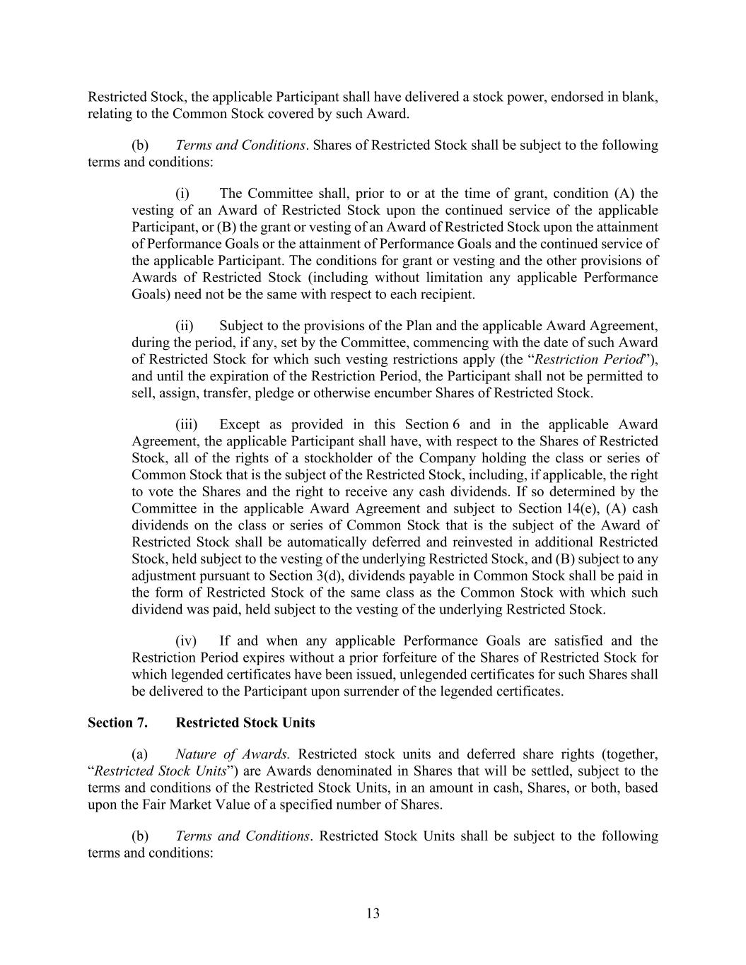 13 Restricted Stock, the applicable Participant shall have delivered a stock power, endorsed in blank, relating to the Common Stock covered by such Award. (b) Terms and Conditions. Shares of Restricted Stock shall be subject to the following terms and conditions: (i) The Committee shall, prior to or at the time of grant, condition (A) the vesting of an Award of Restricted Stock upon the continued service of the applicable Participant, or (B) the grant or vesting of an Award of Restricted Stock upon the attainment of Performance Goals or the attainment of Performance Goals and the continued service of the applicable Participant. The conditions for grant or vesting and the other provisions of Awards of Restricted Stock (including without limitation any applicable Performance Goals) need not be the same with respect to each recipient. (ii) Subject to the provisions of the Plan and the applicable Award Agreement, during the period, if any, set by the Committee, commencing with the date of such Award of Restricted Stock for which such vesting restrictions apply (the “Restriction Period”), and until the expiration of the Restriction Period, the Participant shall not be permitted to sell, assign, transfer, pledge or otherwise encumber Shares of Restricted Stock. (iii) Except as provided in this Section 6 and in the applicable Award Agreement, the applicable Participant shall have, with respect to the Shares of Restricted Stock, all of the rights of a stockholder of the Company holding the class or series of Common Stock that is the subject of the Restricted Stock, including, if applicable, the right to vote the Shares and the right to receive any cash dividends. If so determined by the Committee in the applicable Award Agreement and subject to Section 14(e), (A) cash dividends on the class or series of Common Stock that is the subject of the Award of Restricted Stock shall be automatically deferred and reinvested in additional Restricted Stock, held subject to the vesting of the underlying Restricted Stock, and (B) subject to any adjustment pursuant to Section 3(d), dividends payable in Common Stock shall be paid in the form of Restricted Stock of the same class as the Common Stock with which such dividend was paid, held subject to the vesting of the underlying Restricted Stock. (iv) If and when any applicable Performance Goals are satisfied and the Restriction Period expires without a prior forfeiture of the Shares of Restricted Stock for which legended certificates have been issued, unlegended certificates for such Shares shall be delivered to the Participant upon surrender of the legended certificates. Section 7. Restricted Stock Units (a) Nature of Awards. Restricted stock units and deferred share rights (together, “Restricted Stock Units”) are Awards denominated in Shares that will be settled, subject to the terms and conditions of the Restricted Stock Units, in an amount in cash, Shares, or both, based upon the Fair Market Value of a specified number of Shares. (b) Terms and Conditions. Restricted Stock Units shall be subject to the following terms and conditions: