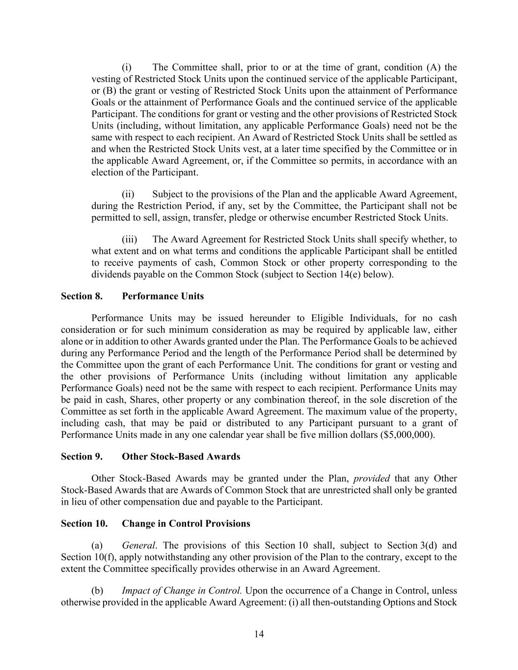 14 (i) The Committee shall, prior to or at the time of grant, condition (A) the vesting of Restricted Stock Units upon the continued service of the applicable Participant, or (B) the grant or vesting of Restricted Stock Units upon the attainment of Performance Goals or the attainment of Performance Goals and the continued service of the applicable Participant. The conditions for grant or vesting and the other provisions of Restricted Stock Units (including, without limitation, any applicable Performance Goals) need not be the same with respect to each recipient. An Award of Restricted Stock Units shall be settled as and when the Restricted Stock Units vest, at a later time specified by the Committee or in the applicable Award Agreement, or, if the Committee so permits, in accordance with an election of the Participant. (ii) Subject to the provisions of the Plan and the applicable Award Agreement, during the Restriction Period, if any, set by the Committee, the Participant shall not be permitted to sell, assign, transfer, pledge or otherwise encumber Restricted Stock Units. (iii) The Award Agreement for Restricted Stock Units shall specify whether, to what extent and on what terms and conditions the applicable Participant shall be entitled to receive payments of cash, Common Stock or other property corresponding to the dividends payable on the Common Stock (subject to Section 14(e) below). Section 8. Performance Units Performance Units may be issued hereunder to Eligible Individuals, for no cash consideration or for such minimum consideration as may be required by applicable law, either alone or in addition to other Awards granted under the Plan. The Performance Goals to be achieved during any Performance Period and the length of the Performance Period shall be determined by the Committee upon the grant of each Performance Unit. The conditions for grant or vesting and the other provisions of Performance Units (including without limitation any applicable Performance Goals) need not be the same with respect to each recipient. Performance Units may be paid in cash, Shares, other property or any combination thereof, in the sole discretion of the Committee as set forth in the applicable Award Agreement. The maximum value of the property, including cash, that may be paid or distributed to any Participant pursuant to a grant of Performance Units made in any one calendar year shall be five million dollars ($5,000,000). Section 9. Other Stock-Based Awards Other Stock-Based Awards may be granted under the Plan, provided that any Other Stock-Based Awards that are Awards of Common Stock that are unrestricted shall only be granted in lieu of other compensation due and payable to the Participant. Section 10. Change in Control Provisions (a) General. The provisions of this Section 10 shall, subject to Section 3(d) and Section 10(f), apply notwithstanding any other provision of the Plan to the contrary, except to the extent the Committee specifically provides otherwise in an Award Agreement. (b) Impact of Change in Control. Upon the occurrence of a Change in Control, unless otherwise provided in the applicable Award Agreement: (i) all then-outstanding Options and Stock