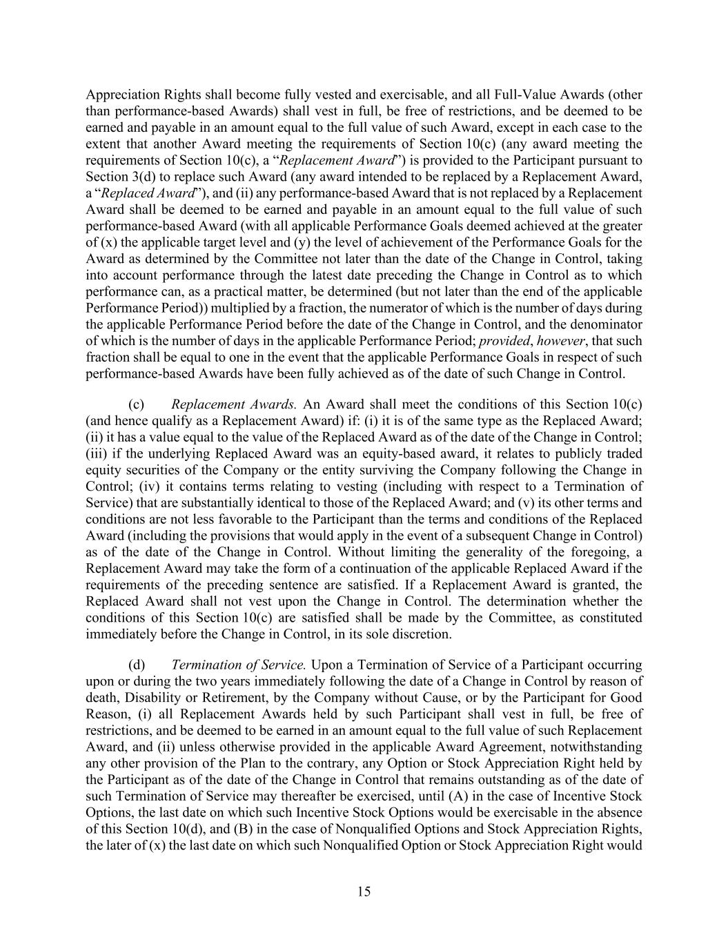 15 Appreciation Rights shall become fully vested and exercisable, and all Full-Value Awards (other than performance-based Awards) shall vest in full, be free of restrictions, and be deemed to be earned and payable in an amount equal to the full value of such Award, except in each case to the extent that another Award meeting the requirements of Section 10(c) (any award meeting the requirements of Section 10(c), a “Replacement Award”) is provided to the Participant pursuant to Section 3(d) to replace such Award (any award intended to be replaced by a Replacement Award, a “Replaced Award”), and (ii) any performance-based Award that is not replaced by a Replacement Award shall be deemed to be earned and payable in an amount equal to the full value of such performance-based Award (with all applicable Performance Goals deemed achieved at the greater of (x) the applicable target level and (y) the level of achievement of the Performance Goals for the Award as determined by the Committee not later than the date of the Change in Control, taking into account performance through the latest date preceding the Change in Control as to which performance can, as a practical matter, be determined (but not later than the end of the applicable Performance Period)) multiplied by a fraction, the numerator of which is the number of days during the applicable Performance Period before the date of the Change in Control, and the denominator of which is the number of days in the applicable Performance Period; provided, however, that such fraction shall be equal to one in the event that the applicable Performance Goals in respect of such performance-based Awards have been fully achieved as of the date of such Change in Control. (c) Replacement Awards. An Award shall meet the conditions of this Section 10(c) (and hence qualify as a Replacement Award) if: (i) it is of the same type as the Replaced Award; (ii) it has a value equal to the value of the Replaced Award as of the date of the Change in Control; (iii) if the underlying Replaced Award was an equity-based award, it relates to publicly traded equity securities of the Company or the entity surviving the Company following the Change in Control; (iv) it contains terms relating to vesting (including with respect to a Termination of Service) that are substantially identical to those of the Replaced Award; and (v) its other terms and conditions are not less favorable to the Participant than the terms and conditions of the Replaced Award (including the provisions that would apply in the event of a subsequent Change in Control) as of the date of the Change in Control. Without limiting the generality of the foregoing, a Replacement Award may take the form of a continuation of the applicable Replaced Award if the requirements of the preceding sentence are satisfied. If a Replacement Award is granted, the Replaced Award shall not vest upon the Change in Control. The determination whether the conditions of this Section 10(c) are satisfied shall be made by the Committee, as constituted immediately before the Change in Control, in its sole discretion. (d) Termination of Service. Upon a Termination of Service of a Participant occurring upon or during the two years immediately following the date of a Change in Control by reason of death, Disability or Retirement, by the Company without Cause, or by the Participant for Good Reason, (i) all Replacement Awards held by such Participant shall vest in full, be free of restrictions, and be deemed to be earned in an amount equal to the full value of such Replacement Award, and (ii) unless otherwise provided in the applicable Award Agreement, notwithstanding any other provision of the Plan to the contrary, any Option or Stock Appreciation Right held by the Participant as of the date of the Change in Control that remains outstanding as of the date of such Termination of Service may thereafter be exercised, until (A) in the case of Incentive Stock Options, the last date on which such Incentive Stock Options would be exercisable in the absence of this Section 10(d), and (B) in the case of Nonqualified Options and Stock Appreciation Rights, the later of (x) the last date on which such Nonqualified Option or Stock Appreciation Right would