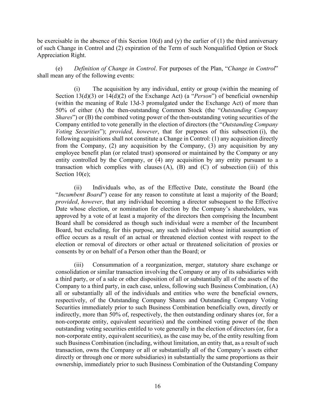 16 be exercisable in the absence of this Section 10(d) and (y) the earlier of (1) the third anniversary of such Change in Control and (2) expiration of the Term of such Nonqualified Option or Stock Appreciation Right. (e) Definition of Change in Control. For purposes of the Plan, “Change in Control” shall mean any of the following events: (i) The acquisition by any individual, entity or group (within the meaning of Section 13(d)(3) or 14(d)(2) of the Exchange Act) (a “Person”) of beneficial ownership (within the meaning of Rule 13d-3 promulgated under the Exchange Act) of more than 50% of either (A) the then-outstanding Common Stock (the “Outstanding Company Shares”) or (B) the combined voting power of the then-outstanding voting securities of the Company entitled to vote generally in the election of directors (the “Outstanding Company Voting Securities”); provided, however, that for purposes of this subsection (i), the following acquisitions shall not constitute a Change in Control: (1) any acquisition directly from the Company, (2) any acquisition by the Company, (3) any acquisition by any employee benefit plan (or related trust) sponsored or maintained by the Company or any entity controlled by the Company, or (4) any acquisition by any entity pursuant to a transaction which complies with clauses (A), (B) and (C) of subsection (iii) of this Section 10(e); (ii) Individuals who, as of the Effective Date, constitute the Board (the “Incumbent Board”) cease for any reason to constitute at least a majority of the Board; provided, however, that any individual becoming a director subsequent to the Effective Date whose election, or nomination for election by the Company’s shareholders, was approved by a vote of at least a majority of the directors then comprising the Incumbent Board shall be considered as though such individual were a member of the Incumbent Board, but excluding, for this purpose, any such individual whose initial assumption of office occurs as a result of an actual or threatened election contest with respect to the election or removal of directors or other actual or threatened solicitation of proxies or consents by or on behalf of a Person other than the Board; or (iii) Consummation of a reorganization, merger, statutory share exchange or consolidation or similar transaction involving the Company or any of its subsidiaries with a third party, or of a sale or other disposition of all or substantially all of the assets of the Company to a third party, in each case, unless, following such Business Combination, (A) all or substantially all of the individuals and entities who were the beneficial owners, respectively, of the Outstanding Company Shares and Outstanding Company Voting Securities immediately prior to such Business Combination beneficially own, directly or indirectly, more than 50% of, respectively, the then outstanding ordinary shares (or, for a non-corporate entity, equivalent securities) and the combined voting power of the then outstanding voting securities entitled to vote generally in the election of directors (or, for a non-corporate entity, equivalent securities), as the case may be, of the entity resulting from such Business Combination (including, without limitation, an entity that, as a result of such transaction, owns the Company or all or substantially all of the Company’s assets either directly or through one or more subsidiaries) in substantially the same proportions as their ownership, immediately prior to such Business Combination of the Outstanding Company