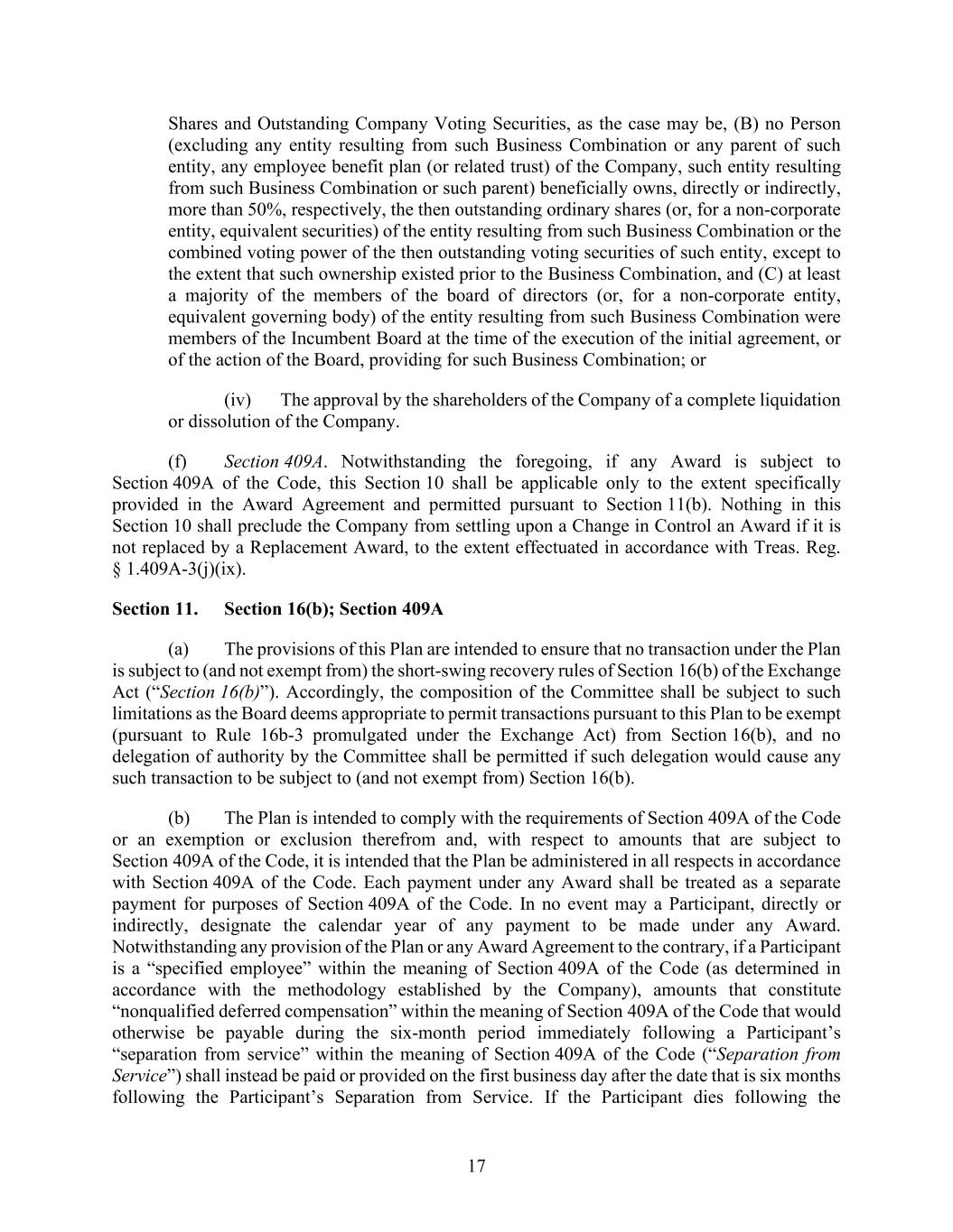 17 Shares and Outstanding Company Voting Securities, as the case may be, (B) no Person (excluding any entity resulting from such Business Combination or any parent of such entity, any employee benefit plan (or related trust) of the Company, such entity resulting from such Business Combination or such parent) beneficially owns, directly or indirectly, more than 50%, respectively, the then outstanding ordinary shares (or, for a non-corporate entity, equivalent securities) of the entity resulting from such Business Combination or the combined voting power of the then outstanding voting securities of such entity, except to the extent that such ownership existed prior to the Business Combination, and (C) at least a majority of the members of the board of directors (or, for a non-corporate entity, equivalent governing body) of the entity resulting from such Business Combination were members of the Incumbent Board at the time of the execution of the initial agreement, or of the action of the Board, providing for such Business Combination; or (iv) The approval by the shareholders of the Company of a complete liquidation or dissolution of the Company. (f) Section 409A. Notwithstanding the foregoing, if any Award is subject to Section 409A of the Code, this Section 10 shall be applicable only to the extent specifically provided in the Award Agreement and permitted pursuant to Section 11(b). Nothing in this Section 10 shall preclude the Company from settling upon a Change in Control an Award if it is not replaced by a Replacement Award, to the extent effectuated in accordance with Treas. Reg. § 1.409A-3(j)(ix). Section 11. Section 16(b); Section 409A (a) The provisions of this Plan are intended to ensure that no transaction under the Plan is subject to (and not exempt from) the short-swing recovery rules of Section 16(b) of the Exchange Act (“Section 16(b)”). Accordingly, the composition of the Committee shall be subject to such limitations as the Board deems appropriate to permit transactions pursuant to this Plan to be exempt (pursuant to Rule 16b-3 promulgated under the Exchange Act) from Section 16(b), and no delegation of authority by the Committee shall be permitted if such delegation would cause any such transaction to be subject to (and not exempt from) Section 16(b). (b) The Plan is intended to comply with the requirements of Section 409A of the Code or an exemption or exclusion therefrom and, with respect to amounts that are subject to Section 409A of the Code, it is intended that the Plan be administered in all respects in accordance with Section 409A of the Code. Each payment under any Award shall be treated as a separate payment for purposes of Section 409A of the Code. In no event may a Participant, directly or indirectly, designate the calendar year of any payment to be made under any Award. Notwithstanding any provision of the Plan or any Award Agreement to the contrary, if a Participant is a “specified employee” within the meaning of Section 409A of the Code (as determined in accordance with the methodology established by the Company), amounts that constitute “nonqualified deferred compensation” within the meaning of Section 409A of the Code that would otherwise be payable during the six-month period immediately following a Participant’s “separation from service” within the meaning of Section 409A of the Code (“Separation from Service”) shall instead be paid or provided on the first business day after the date that is six months following the Participant’s Separation from Service. If the Participant dies following the