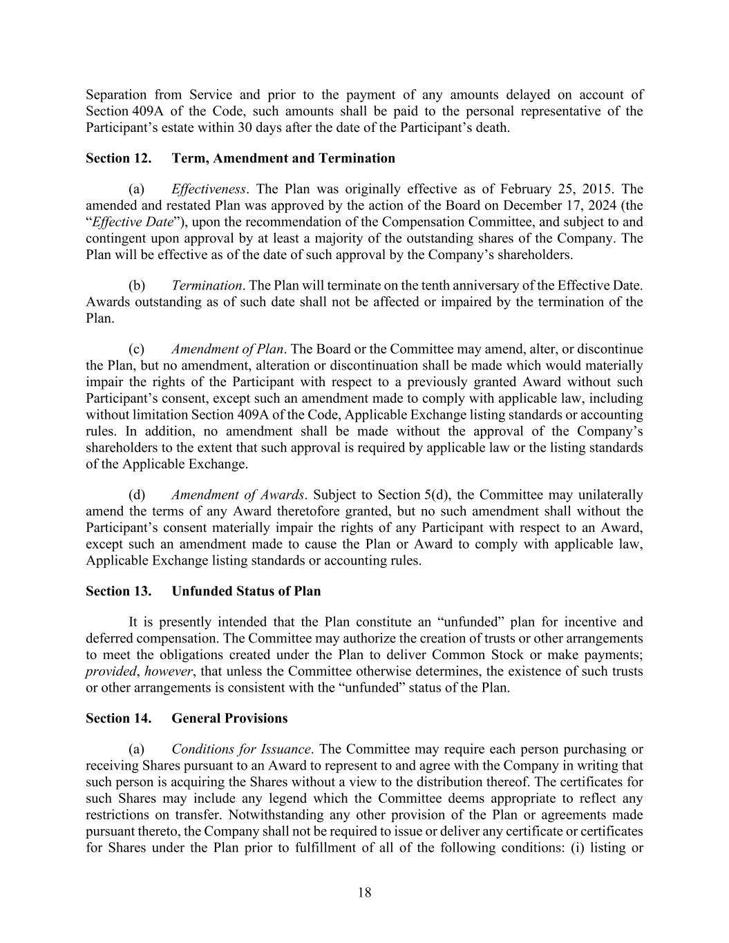 18 Separation from Service and prior to the payment of any amounts delayed on account of Section 409A of the Code, such amounts shall be paid to the personal representative of the Participant’s estate within 30 days after the date of the Participant’s death. Section 12. Term, Amendment and Termination (a) Effectiveness. The Plan was originally effective as of February 25, 2015. The amended and restated Plan was approved by the action of the Board on December 17, 2024 (the “Effective Date”), upon the recommendation of the Compensation Committee, and subject to and contingent upon approval by at least a majority of the outstanding shares of the Company. The Plan will be effective as of the date of such approval by the Company’s shareholders. (b) Termination. The Plan will terminate on the tenth anniversary of the Effective Date. Awards outstanding as of such date shall not be affected or impaired by the termination of the Plan. (c) Amendment of Plan. The Board or the Committee may amend, alter, or discontinue the Plan, but no amendment, alteration or discontinuation shall be made which would materially impair the rights of the Participant with respect to a previously granted Award without such Participant’s consent, except such an amendment made to comply with applicable law, including without limitation Section 409A of the Code, Applicable Exchange listing standards or accounting rules. In addition, no amendment shall be made without the approval of the Company’s shareholders to the extent that such approval is required by applicable law or the listing standards of the Applicable Exchange. (d) Amendment of Awards. Subject to Section 5(d), the Committee may unilaterally amend the terms of any Award theretofore granted, but no such amendment shall without the Participant’s consent materially impair the rights of any Participant with respect to an Award, except such an amendment made to cause the Plan or Award to comply with applicable law, Applicable Exchange listing standards or accounting rules. Section 13. Unfunded Status of Plan It is presently intended that the Plan constitute an “unfunded” plan for incentive and deferred compensation. The Committee may authorize the creation of trusts or other arrangements to meet the obligations created under the Plan to deliver Common Stock or make payments; provided, however, that unless the Committee otherwise determines, the existence of such trusts or other arrangements is consistent with the “unfunded” status of the Plan. Section 14. General Provisions (a) Conditions for Issuance. The Committee may require each person purchasing or receiving Shares pursuant to an Award to represent to and agree with the Company in writing that such person is acquiring the Shares without a view to the distribution thereof. The certificates for such Shares may include any legend which the Committee deems appropriate to reflect any restrictions on transfer. Notwithstanding any other provision of the Plan or agreements made pursuant thereto, the Company shall not be required to issue or deliver any certificate or certificates for Shares under the Plan prior to fulfillment of all of the following conditions: (i) listing or