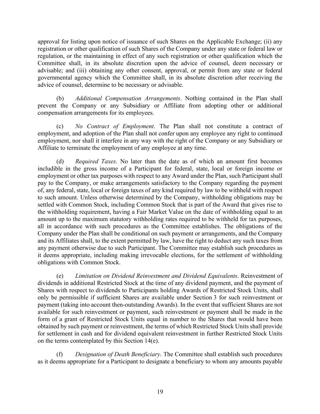 19 approval for listing upon notice of issuance of such Shares on the Applicable Exchange; (ii) any registration or other qualification of such Shares of the Company under any state or federal law or regulation, or the maintaining in effect of any such registration or other qualification which the Committee shall, in its absolute discretion upon the advice of counsel, deem necessary or advisable; and (iii) obtaining any other consent, approval, or permit from any state or federal governmental agency which the Committee shall, in its absolute discretion after receiving the advice of counsel, determine to be necessary or advisable. (b) Additional Compensation Arrangements. Nothing contained in the Plan shall prevent the Company or any Subsidiary or Affiliate from adopting other or additional compensation arrangements for its employees. (c) No Contract of Employment. The Plan shall not constitute a contract of employment, and adoption of the Plan shall not confer upon any employee any right to continued employment, nor shall it interfere in any way with the right of the Company or any Subsidiary or Affiliate to terminate the employment of any employee at any time. (d) Required Taxes. No later than the date as of which an amount first becomes includible in the gross income of a Participant for federal, state, local or foreign income or employment or other tax purposes with respect to any Award under the Plan, such Participant shall pay to the Company, or make arrangements satisfactory to the Company regarding the payment of, any federal, state, local or foreign taxes of any kind required by law to be withheld with respect to such amount. Unless otherwise determined by the Company, withholding obligations may be settled with Common Stock, including Common Stock that is part of the Award that gives rise to the withholding requirement, having a Fair Market Value on the date of withholding equal to an amount up to the maximum statutory withholding rates required to be withheld for tax purposes, all in accordance with such procedures as the Committee establishes. The obligations of the Company under the Plan shall be conditional on such payment or arrangements, and the Company and its Affiliates shall, to the extent permitted by law, have the right to deduct any such taxes from any payment otherwise due to such Participant. The Committee may establish such procedures as it deems appropriate, including making irrevocable elections, for the settlement of withholding obligations with Common Stock. (e) Limitation on Dividend Reinvestment and Dividend Equivalents. Reinvestment of dividends in additional Restricted Stock at the time of any dividend payment, and the payment of Shares with respect to dividends to Participants holding Awards of Restricted Stock Units, shall only be permissible if sufficient Shares are available under Section 3 for such reinvestment or payment (taking into account then-outstanding Awards). In the event that sufficient Shares are not available for such reinvestment or payment, such reinvestment or payment shall be made in the form of a grant of Restricted Stock Units equal in number to the Shares that would have been obtained by such payment or reinvestment, the terms of which Restricted Stock Units shall provide for settlement in cash and for dividend equivalent reinvestment in further Restricted Stock Units on the terms contemplated by this Section 14(e). (f) Designation of Death Beneficiary. The Committee shall establish such procedures as it deems appropriate for a Participant to designate a beneficiary to whom any amounts payable
