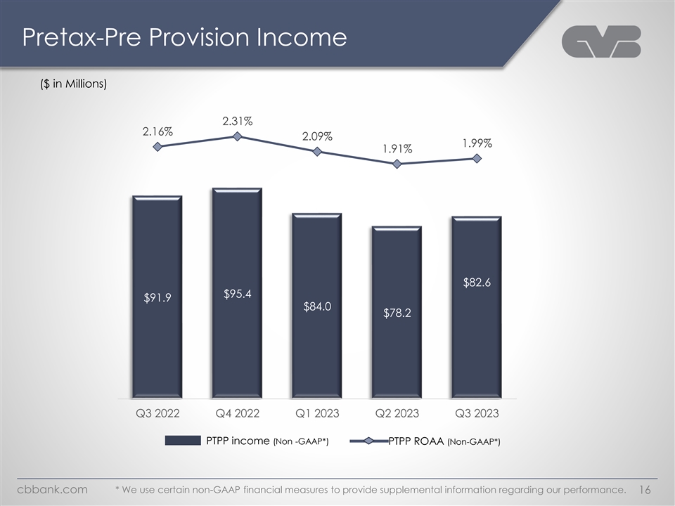 Selected Highlights Q3’22 Q2’23 Q3’23 ($ in Thousands) Average Cash & Cash Equivalents $ 810,089 $ 525,566 $ 644,006 Average Loans 8,699,303 8,892,413 8,862,462 Average PPP Loans 38,198 5,461 3,910 Average Total Securities 6,033,696 5,689,606 5,542,590 Average Balance Average Noninterest-bearing Deposits 9,009,962 7,823,496 7,813,120 Sheet Average Total Deposits & Customer 14,731,483 12,800,441 12,923,826 Repurchase Agreements Average Borrowings 9 1,526,958 1,318,098 Loan-to-deposit 61.19% 72.27% 70.43% Noninterest-bearing deposits/Total Deposits 63.38% 63.58% 62.09% cbbank.com 15