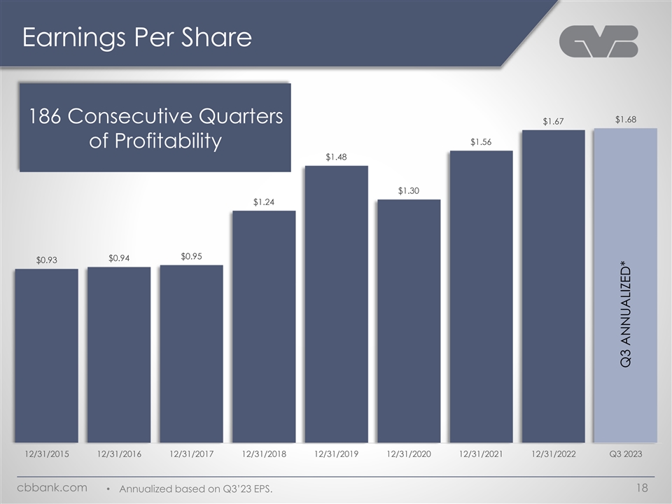 Dividends – 136 Consecutive Quarters 136 Consecutive Quarters $0.80 More than 30 years of cash $0.77 $0.72 $0.72 $0.72 dividends since 1989 $0.56 $0.54 $0.48 $0.48 48.40% 12/31/2015 12/31/2016 12/31/2017 12/31/2018 12/31/2019 12/31/2020 12/31/2021 12/31/2022 Q3 2023 Dividends per Share Dividend Payout Ratio cbbank.com 17 • Dividend payout ratio calculated on per share basis. Annualized based on YTD dividends/YTD net earnings. ANNUALIZED*