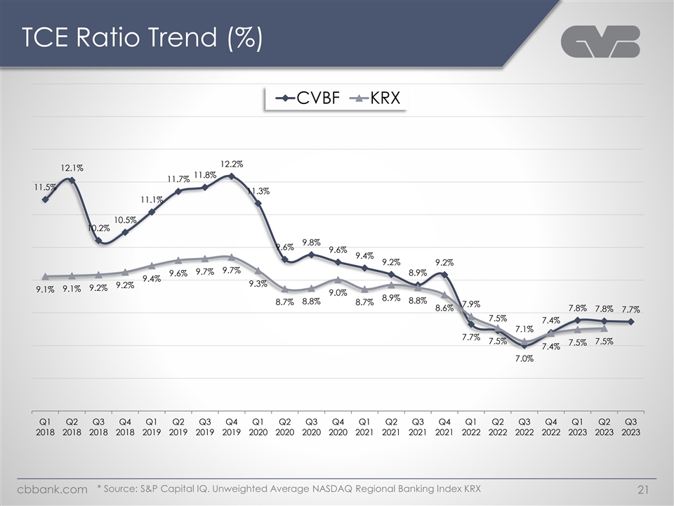 CET1 Ratio Trend (%) 17.1% CVBF KRX 16.9% 15.1% 14.9% 14.9% 14.9% 14.8% 14.8% Community Suncrest 14.6% 14.6% 14.5% Bank Q3’18 14.4% Q1’22 14.3% 14.1% 14.1% 13.8% 13.8% 13.6% 13.6% 13.5% 13.4% 13.0% 12.9% 12.8% 12.8% 12.8% 12.5% 12.5% 12.2% 12.1% 12.1% 12.0% 12.0% 12.0% 12.0% 12.0% 12.0% 12.0% 11.9% 11.9% 11.8% 11.8% 11.8% 11.7% 11.7% Q1 Q2 Q3 Q4 Q1 Q2 Q3 Q4 Q1 Q2 Q3 Q4 Q1 Q2 Q3 Q4 Q1 Q2 Q3 Q4 Q1 Q2 Q3 2018 2018 2018 2018 2019 2019 2019 2019 2020 2020 2020 2020 2021 2021 2021 2021 2022 2022 2022 2022 2023 2023 2023 * Source: S&P Capital IQ. Unweighted Average NASDAQ Regional Banking Index KRX cbbank.com 20
