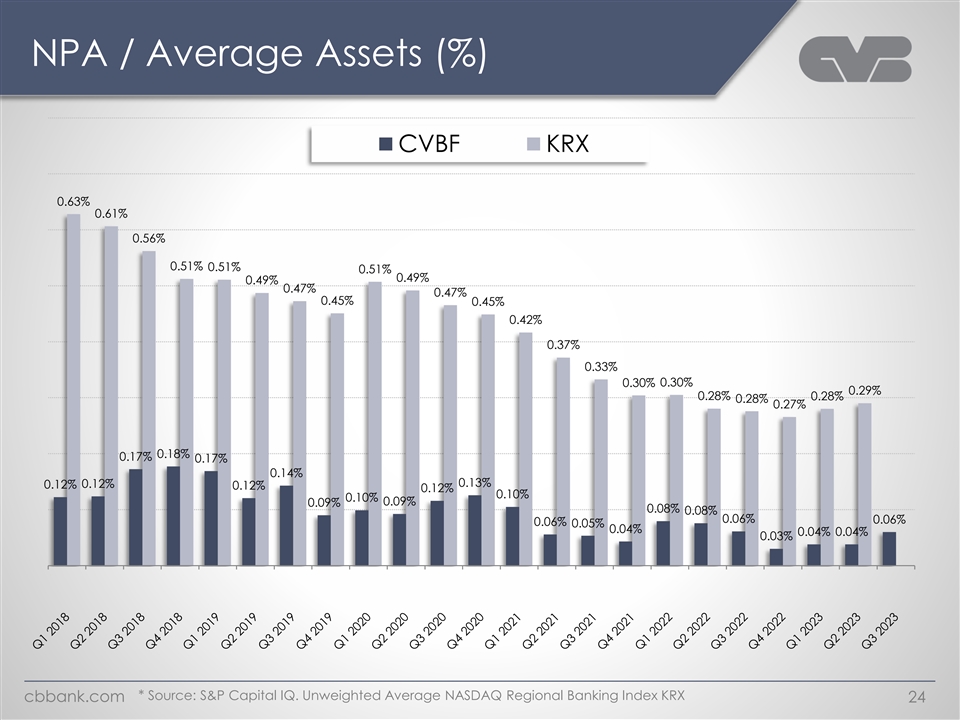 Net Charge-Offs / Average Loans (%) CVBF KRX 0.08% 0.06% 0.06% 0.05% 0.05% 0.05% 0.04% 0.04% 0.04% 0.04% 0.04% 0.04% 0.04% 0.03% 0.03% 0.03% 0.03% 0.03% 0.02% 0.02% 0.02% 0.01% 0.01% 0.01% 0.00% 0.00% 0.00% 0.00% 0.00% 0.00% 0.00% 0.00% 0.00% 0.00% 0.00% 0.00% 0.00% 0.00% 0.00% 0.00% 0.00% -0.01% -0.01% -0.01% -0.03% * Source: S&P Capital IQ. Unweighted Average NASDAQ Regional Banking Index KRX cbbank.com 23