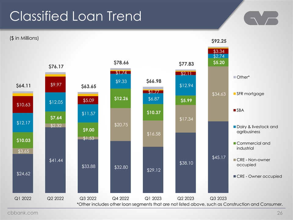 Classified Loans / Total Loans (%) CVBF KRX 2.1% 2.1% 2.0% 1.9% 1.8% 1.8% 1.7% 1.6% 1.6% 1.6% 1.5% 1.5% 1.5% 1.5% 1.5% 1.5% 1.4% 1.4% 1.3% 1.2% 1.2% 1.2% 1.1% 1.0% 1.0% 1.0% 0.9% 0.9% 0.9% 0.9% 0.9% 0.8% 0.8% 0.8% 0.8% 0.7% 0.7% 0.7% 0.7% 0.7% 0.7% 0.7% 0.6% 0.6% 0.6% * Source: S&P Capital IQ. Unweighted Average NASDAQ Regional Banking Index KRX cbbank.com 25