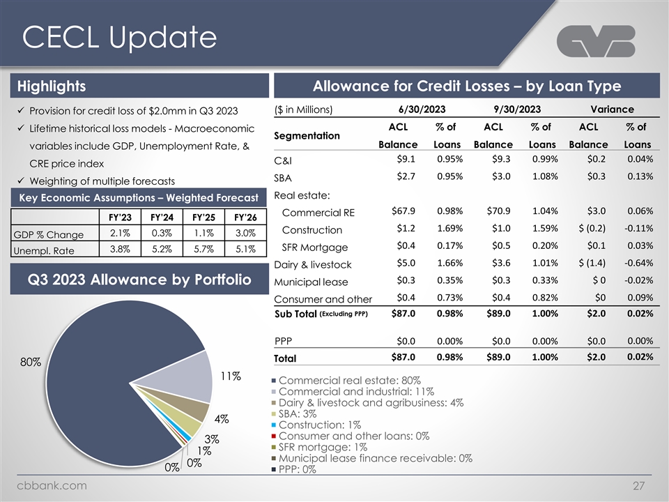Classified Loan Trend ($ in Millions) $92.25 $3.34 $2.74 $5.20 $78.66 $77.83 $76.17 $1.74 $2.11 Other* $9.33 $66.98 $9.97 $12.94 $64.11 $63.65 $1.77 SFR mortgage $34.63 $12.26 $6.87 $5.09 $5.99 $12.05 $10.63 SBA $10.37 $11.57 $7.64 $17.34 $12.17 $20.75 $2.32 Dairy & livestock and $9.00 agribusiness $16.58 $1.53 $10.03 Commercial and industrial $3.65 $45.17 CRE - Non-owner $41.44 $38.10 occupied $33.88 $32.80 $29.12 $24.62 CRE - Owner occupied Q1 2022 Q2 2022 Q3 2022 Q4 2022 Q1 2023 Q2 2023 Q3 2023 *Other includes other loan segments that are not listed above, such as Construction and Consumer. cbbank.com 26