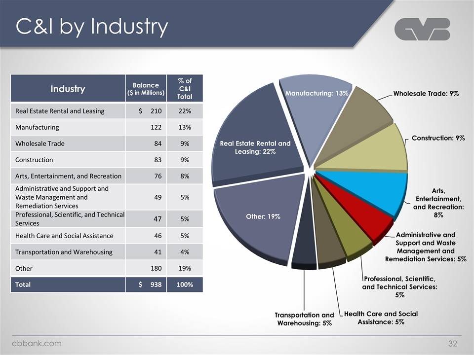 CRE by Collateral Origination Year Balance % of Avg. Size Classified Collateral LTV at 2018 or ($ in Owner ($ in ($ in 2023 2022 2021 2020 2019 Type Origination earlier Millions) Occupied Millions) Millions) Industrial $ 2,283 49% 50% $ 1.63 $ 14.74 7% 21% 19% 11% 7% 35% 1,141 24% 55% 1.69 - 3% 23% 14% 17% 9% 34% Office Retail 958 12.0% 48% 1.70 22.81 4% 23% 19% 13% 7% 34% Multi- 834 0% 49% 1.60 - 8% 21% 18% 19% 11% 23% Family Other 597 56% 47% 1.50 13.58 7% 13% 19% 11% 13% 37% Farmland 509 99% 46% 1.55 28.62 3% 21% 16% 22% 11% 27% 315 33% 58% 1.53 0.04 3% 13% 17% 14% 6% 47% Medical Other RE Rental & 206 9% 49% 1.93 - 11% 22% 15% 5% 6% 41% Leasing $ 6,843 36% 50% $ 1.63 $ 79.79 5% 20% 18% 14% 9% 34% Total cbbank.com 31