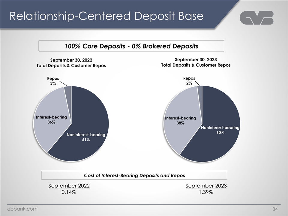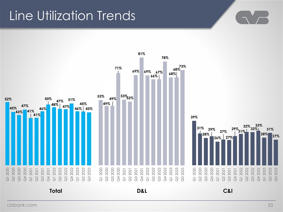 Line Utilization Trends 81% 78% 73% 71% 68% 69% 69% 67% 68% 66% 53% 53% 52% 50% 49% 52% 51% 47% 45% 49% 48% 47% 47% 45% 46% 46% 45% 41% 43% 41% 39% 33% 32% 31% 32% 29% 29% 31% 27% 31% 28% 28% 27% 27% 26% Total D&L C&I cbbank.com 33 Q1 2020 Q2 2020 Q3 2020 Q4 2020 Q1 2021 Q2 2021 Q3 2021 Q4 2021 Q1 2022 Q2 2022 Q3 2022 Q4 2022 Q1 2023 Q2 2023 Q3 2023 Q1 2020 Q2 2020 Q3 2020 Q4 2020 Q1 2021 Q2 2021 Q3 2021 Q4 2021 Q1 2022 Q2 2022 Q3 2022 Q4 2022 Q1 2023 Q2 2023 Q3 2023 Q1 2020 Q2 2020 Q3 2020 Q4 2020 Q1 2021 Q2 2021 Q3 2021 Q4 2021 Q1 2022 Q2 2022 Q3 2022 Q4 2022 Q1 2023 Q2 2023 Q3 2023