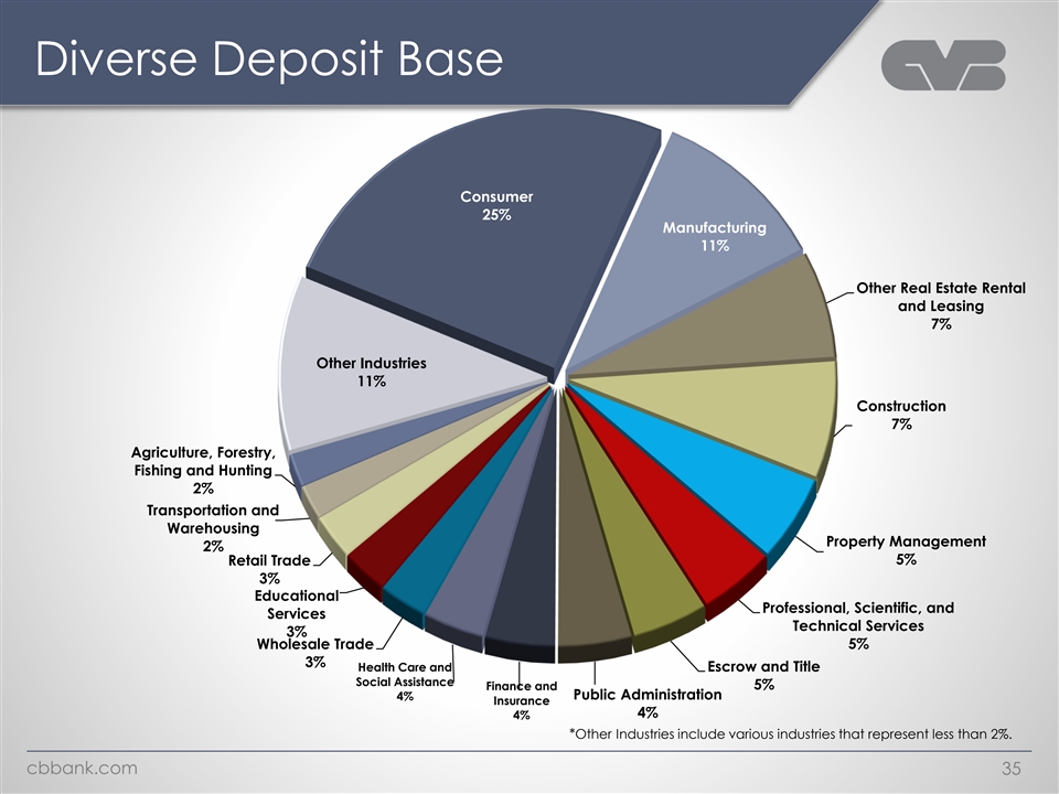 Diverse Deposit Base Consumer 25% Manufacturing 11% Other Real Estate Rental and Leasing 7% Other Industries 11% Construction 7% Agriculture, Forestry, Fishing and Hunting 2% Transportation and Warehousing Property Management 2% 5% Retail Trade 3% Educational Professional, Scientific, and Services Technical Services 3% 5% Wholesale Trade 3% Health Care and Escrow and Title Social Assistance 5% Finance and Public Administration 4% Insurance 4% 4% *Other Industries include various industries that represent less than 2%. cbbank.com 35