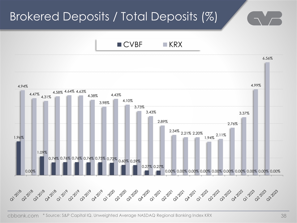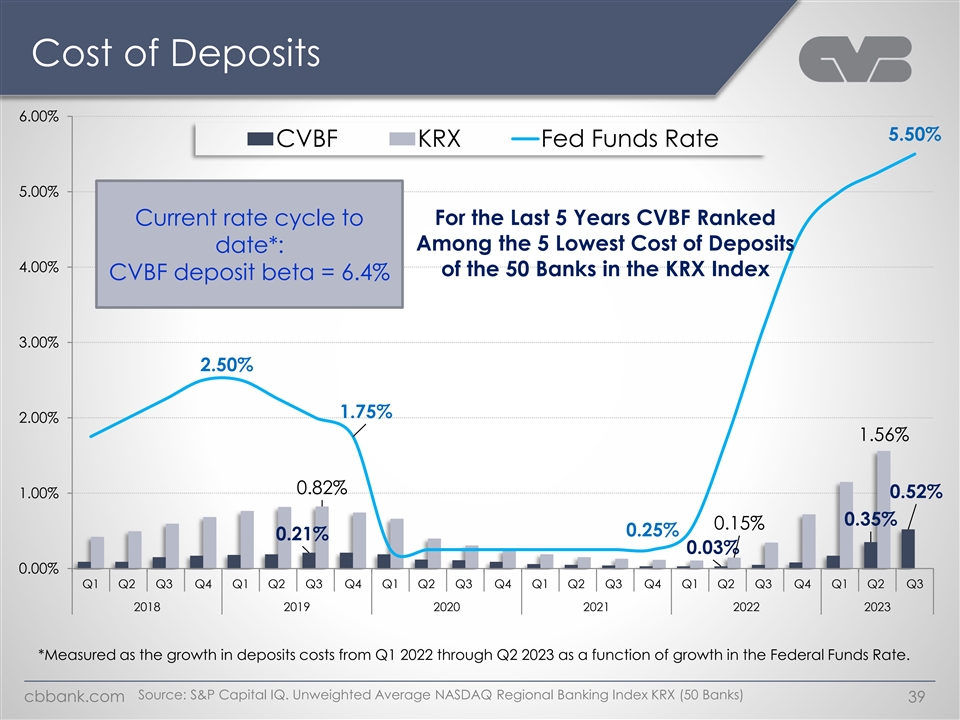 Brokered Deposits / Total Deposits (%) CVBF KRX 6.56% 4.99% 4.94% 4.64% 4.63% 4.58% 4.47% 4.43% 4.38% 4.31% 4.10% 3.98% 3.73% 3.43% 3.37% 2.89% 2.76% 2.34% 2.21% 2.20% 2.11% 1.96% 1.94% 1.09% 0.76% 0.76% 0.74% 0.74% 0.75% 0.72% 0.60% 0.59% 0.27% 0.27% 0.00% 0.00% 0.00% 0.00% 0.00% 0.00% 0.00% 0.00% 0.00% 0.00% 0.00% * Source: S&P Capital IQ. Unweighted Average NASDAQ Regional Banking Index KRX cbbank.com 38