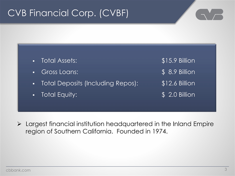 Forward Looking Statements This presentation contains forward-looking statements that are intended to be covered by the safe harbor for such statements provided by the Private Securities Litigation Reform Act of 1995. These statements are based on the current beliefs and expectations of the management of CVB Financial Corp. and Citizens Business Bank (collectively, the “Company”) and are subject to significant risks and uncertainties that could cause actual results or performance to differ materially from those projected. You should not place undue reliance on these statements. Factors that could cause the Company’s actual results to differ materially from those described in the forward-looking statements include, among others, changes in the U.S. economy or local, regional and global business, economic and political conditions; changes in laws or the regulatory environment, including trade, monetary and fiscal policies and laws; inflation or deflation, interest rate, market and monetary fluctuations; possible changes in our levels of capital or liquidity or our access to government or private lending facilities; possible credit related impairments, goodwill impairments or declines in the fair value of our loans and securities; the effect of acquisitions we have made or may make; changes in the competitive environment, including technological changes; cybersecurity and fraud threats; changes in the commercial and residential real estate markets; changes in customer preferences, borrowing and savings habits; geopolitical conditions, threats of terrorism or military action, catastrophic events or natural disasters such as earthquakes, droughts, pandemics, climate change and extreme weather; fraud and cybersecurity threats; and unanticipated legal or regulatory proceedings or outcomes. These factors also include those contained in the Company’s filings with the Securities and Exchange Commission, including the “Risk Factors” section of the Company’s Annual Report on Form 10-K for the year ended December 31, 2022. When considering these forward-looking statements, you should keep in mind these risks and uncertainties, as well as any cautionary statements that the Company or its management may make from time to time. These forward-looking statements speak solely as of the date they are made and are based only on information then actually known to the Company’s executives who are making the associated statements. The Company does not undertake to update any forward-looking statements except as required by law. Non-GAAP Financial Measures—Certain financial information provided in this presentation has not been prepared in accordance with U.S. generally accepted accounting principles (“GAAP”) and is presented on a non-GAAP basis. Investors and analysts should refer to the reconciliations included in this presentation and should consider the Company’s non-GAAP measures in addition to, not as a substitute for or as superior to, measures prepared in accordance with GAAP. These measures may or may not be comparable to similarly titled measures used by other companies. cbbank.com 2