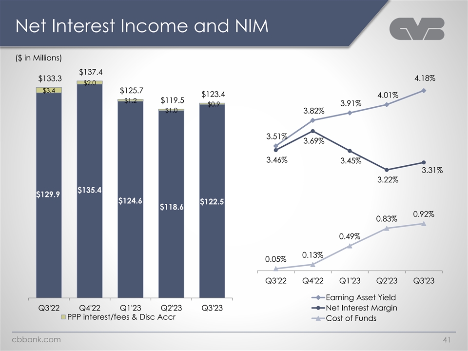 Selected Ratios 2020 2021 2022 Q3’22 Q2’23 Q3’23 ROATCE 14.25% 15.93% 18.85% 21.34% 18.39% 18.82% NIM 3.59% 2.97% 3.30% 3.46% 3.22% 3.31% Cost of Deposits 0.12% 0.04% 0.05% 0.05% 0.35% 0.52% Performance Cost of Funds 0.13% 0.05% 0.06% 0.05% 0.83% 0.92% Efficiency Ratio 41.40% 41.09% 38.98% 36.59% 40.86% 39.99% NIE % Avg. Assets 1.49% 1.24% 1.28% 1.25% 1.32% 1.33% NPA % Total Assets 0.12% 0.04% 0.03% 0.06% 0.04% 0.06% Credit Quality Net Charge-Offs 0.00% 0.04% (0.01%) (0.00%) 0.00% 0.00% (Recoveries) to Avg. Loans CET1 Ratio 14.8% 14.9% 13.5% 13.5% 14.1% 14.4% Capital Total Risk-Based Capital 16.2% 15.6% 14.4% 14.3% 14.9% 15.3% Ratio cbbank.com 13
