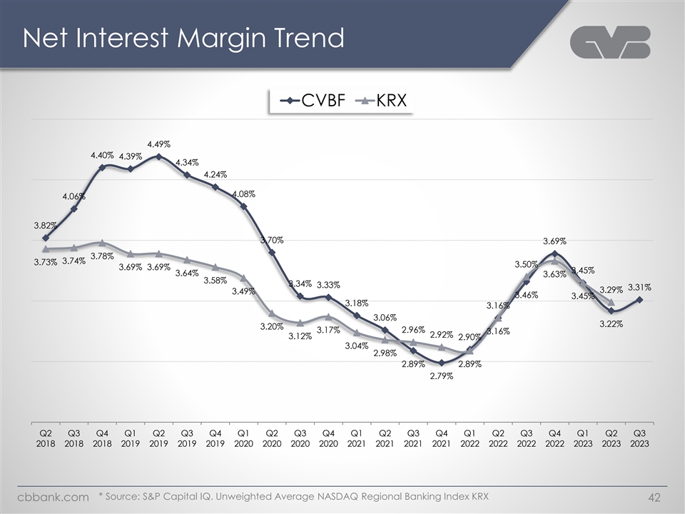 Net Interest Margin Trend CVBF KRX 4.49% 4.40% 4.39% 4.34% 4.24% 4.08% 4.06% 3.82% 3.70% 3.69% 3.78% 3.74% 3.73% 3.50% 3.69% 3.69% 3.45% 3.64% 3.63% 3.58% 3.34% 3.33% 3.31% 3.29% 3.49% 3.46% 3.45% 3.18% 3.16% 3.06% 3.22% 3.20% 3.17% 2.96% 3.16% 2.92% 3.12% 2.90% 3.04% 2.98% 2.89% 2.89% 2.79% Q2 Q3 Q4 Q1 Q2 Q3 Q4 Q1 Q2 Q3 Q4 Q1 Q2 Q3 Q4 Q1 Q2 Q3 Q4 Q1 Q2 Q3 2018 2018 2018 2019 2019 2019 2019 2020 2020 2020 2020 2021 2021 2021 2021 2022 2022 2022 2022 2023 2023 2023 * Source: S&P Capital IQ. Unweighted Average NASDAQ Regional Banking Index KRX cbbank.com 42