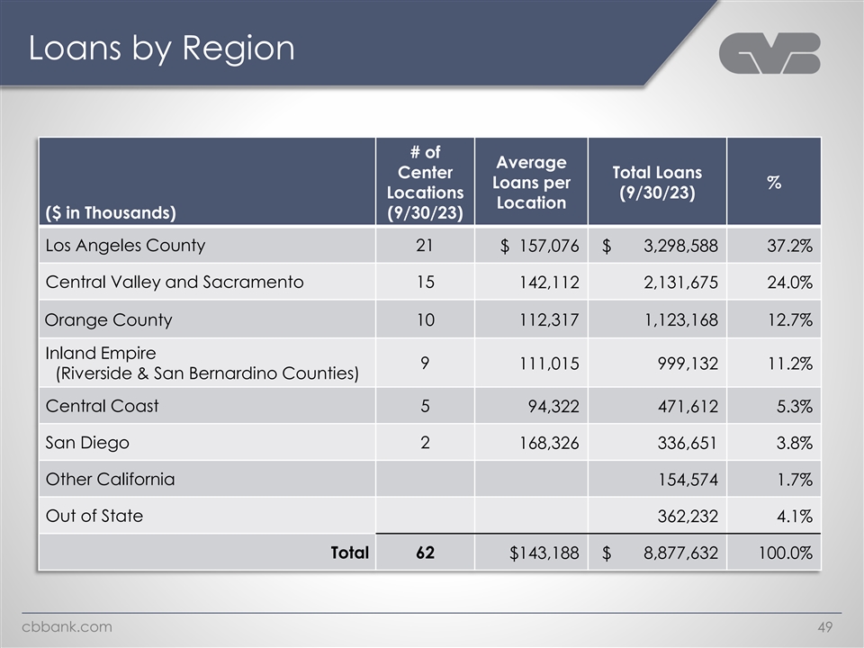 Loans by Region # of Average Center Total Loans Loans per % Locations (9/30/23) Location ($ in Thousands) (9/30/23) Los Angeles County 21 $ 157,076 $ 3,298,588 37.2% Central Valley and Sacramento 15 142,112 2,131,675 24.0% Orange County 10 112,317 1,123,168 12.7% Inland Empire 9 111,015 999,132 11.2% (Riverside & San Bernardino Counties) Central Coast 5 94,322 471,612 5.3% San Diego 2 168,326 336,651 3.8% Other California 154,574 1.7% Out of State 362,232 4.1% Total 62 $143,188 $ 8,877,632 100.0% cbbank.com 49