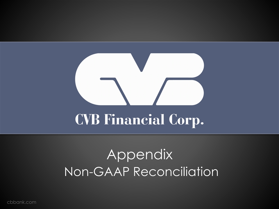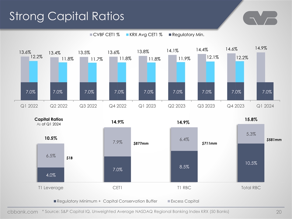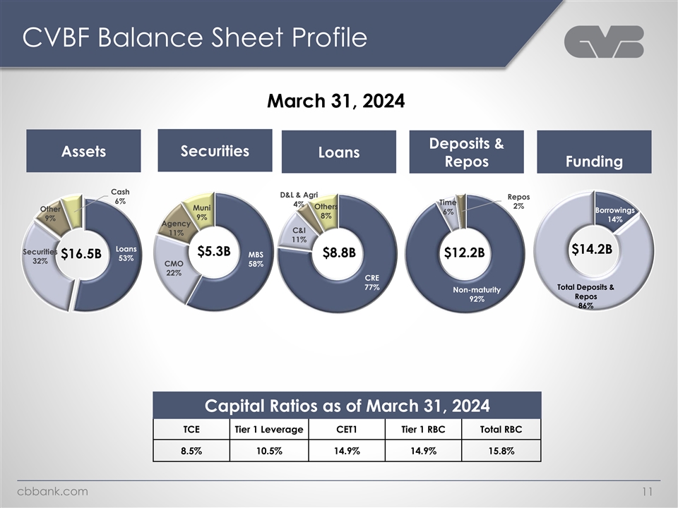 CVBF Balance Sheet Profile March 31, 2024 Deposits & Securities Assets Loans Repos Funding Cash D&L & Agri Repos 6% Time 4% 2% Others Muni Other Borrowings 6% 8% 9% 9% 14% Agency C&I 11% 11% Loans $14.2B Securities $5.3B MBS $8.8B $12.2B $16.5B 53% 32% CMO 58% 22% CRE 77% Total Deposits & Non-maturity Repos 92% 86% Capital Ratios as of March 31, 2024 TCE Tier 1 Leverage CET1 Tier 1 RBC Total RBC 8.5% 10.5% 14.9% 14.9% 15.8% cbbank.com 11