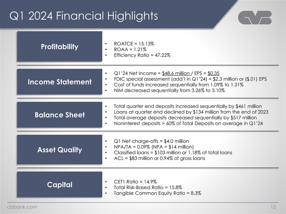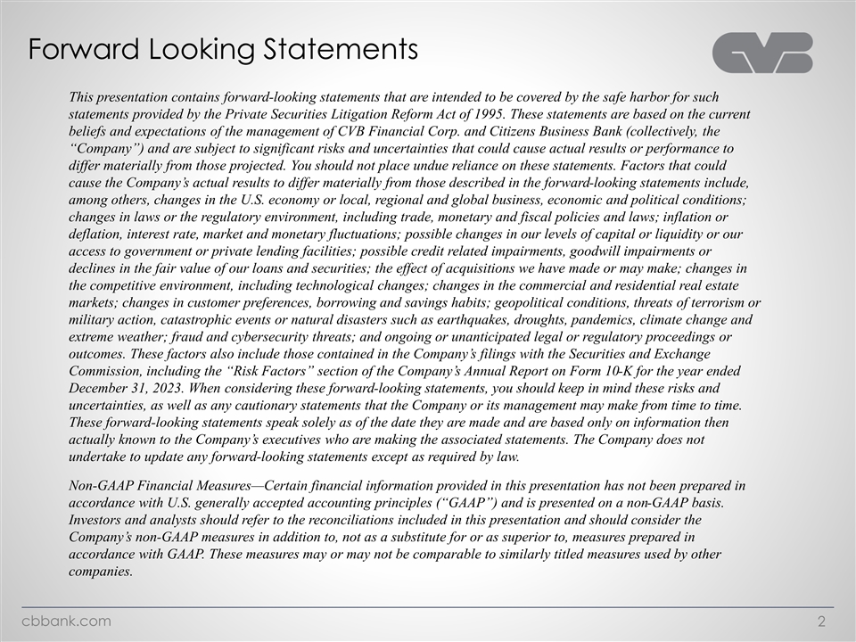 Forward Looking Statements This presentation contains forward-looking statements that are intended to be covered by the safe harbor for such statements provided by the Private Securities Litigation Reform Act of 1995. These statements are based on the current beliefs and expectations of the management of CVB Financial Corp. and Citizens Business Bank (collectively, the “Company”) and are subject to significant risks and uncertainties that could cause actual results or performance to differ materially from those projected. You should not place undue reliance on these statements. Factors that could cause the Company’s actual results to differ materially from those described in the forward-looking statements include, among others, changes in the U.S. economy or local, regional and global business, economic and political conditions; changes in laws or the regulatory environment, including trade, monetary and fiscal policies and laws; inflation or deflation, interest rate, market and monetary fluctuations; possible changes in our levels of capital or liquidity or our access to government or private lending facilities; possible credit related impairments, goodwill impairments or declines in the fair value of our loans and securities; the effect of acquisitions we have made or may make; changes in the competitive environment, including technological changes; changes in the commercial and residential real estate markets; changes in customer preferences, borrowing and savings habits; geopolitical conditions, threats of terrorism or military action, catastrophic events or natural disasters such as earthquakes, droughts, pandemics, climate change and extreme weather; fraud and cybersecurity threats; and ongoing or unanticipated legal or regulatory proceedings or outcomes. These factors also include those contained in the Company’s filings with the Securities and Exchange Commission, including the “Risk Factors” section of the Company’s Annual Report on Form 10-K for the year ended December 31, 2023. When considering these forward-looking statements, you should keep in mind these risks and uncertainties, as well as any cautionary statements that the Company or its management may make from time to time. These forward-looking statements speak solely as of the date they are made and are based only on information then actually known to the Company’s executives who are making the associated statements. The Company does not undertake to update any forward-looking statements except as required by law. Non-GAAP Financial Measures—Certain financial information provided in this presentation has not been prepared in accordance with U.S. generally accepted accounting principles (“GAAP”) and is presented on a non-GAAP basis. Investors and analysts should refer to the reconciliations included in this presentation and should consider the Company’s non-GAAP measures in addition to, not as a substitute for or as superior to, measures prepared in accordance with GAAP. These measures may or may not be comparable to similarly titled measures used by other companies. cbbank.com 2