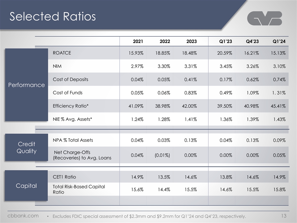Q1 2024 Financial Highlights • ROATCE = 15.13% Profitability • ROAA = 1.21% • Efficiency Ratio = 47.22% • Q1’24 Net Income = $48.6 million / EPS = $0.35 • FDIC special assessment (add’l in Q1’24) = $2.3 million or ($.01) EPS Income Statement • Cost of funds increased sequentially from 1.09% to 1.31% • NIM decreased sequentially from 3.26% to 3.10% • Total quarter end deposits increased sequentially by $461 million • Loans at quarter end declined by $134 million from the end of 2023 Balance Sheet • Total average deposits decreased sequentially by $517 million • Noninterest deposits > 60% of Total Deposits on average in Q1’24 • Q1 Net charge-offs = $4.0 million • NPA/TA = 0.09% (NPA = $14 million) Asset Quality • Classified loans = $103 million or 1.18% of total loans • ACL = $83 million or 0.94% of gross loans • CET1 Ratio = 14.9% Capital • Total Risk-Based Ratio = 15.8% • Tangible Common Equity Ratio = 8.3% cbbank.com 12