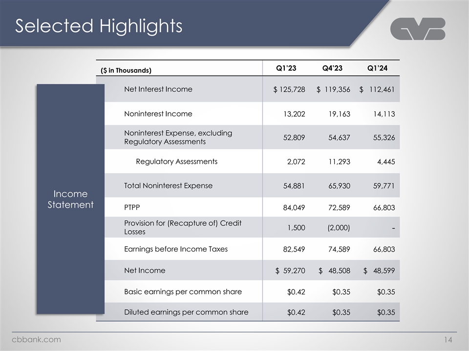Selected Ratios 2021 2022 2023 Q1’23 Q4’23 Q1’24 ROATCE 15.93% 18.85% 18.48% 20.59% 16.21% 15.13% NIM 2.97% 3.30% 3.31% 3.45% 3.26% 3.10% Cost of Deposits 0.04% 0.05% 0.41% 0.17% 0.62% 0.74% Performance Cost of Funds 0.05% 0.06% 0.83% 0.49% 1.09% 1. 31% Efficiency Ratio* 41.09% 38.98% 42.00% 39.50% 40.98% 45.41% NIE % Avg. Assets* 1.24% 1.28% 1.41% 1.36% 1.39% 1.43% NPA % Total Assets 0.04% 0.03% 0.13% 0.04% 0.13% 0.09% Credit Quality Net Charge-Offs 0.04% (0.01%) 0.00% 0.00% 0.00% 0.05% (Recoveries) to Avg. Loans CET1 Ratio 14.9% 13.5% 14.6% 13.8% 14.6% 14.9% Capital Total Risk-Based Capital 15.6% 14.4% 15.5% 14.6% 15.5% 15.8% Ratio cbbank.com 13 • Excludes FDIC special assessment of $2.3mm and $9.2mm for Q1’24 and Q4’23, respectively.