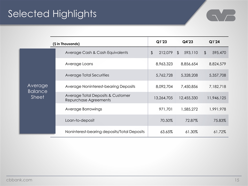 Selected Highlights Q1’23 Q4’23 Q1’24 ($ in Thousands) Average Cash & Cash Equivalents $ 212,079 $ 593,110 $ 595,470 Average Loans 8,963,323 8,856,654 8,824,579 Average Total Securities 5,762,728 5,328,208 5,357,708 Average Average Noninterest-bearing Deposits 8,092,704 7,450,856 7,182,718 Balance Average Total Deposits & Customer Sheet 13,264,705 12,455,330 11,946,125 Repurchase Agreements Average Borrowings 971,701 1,585,272 1,991,978 Loan-to-deposit 70.50% 72.87% 75.83% Noninterest-bearing deposits/Total Deposits 63.65% 61.30% 61.72% cbbank.com 15