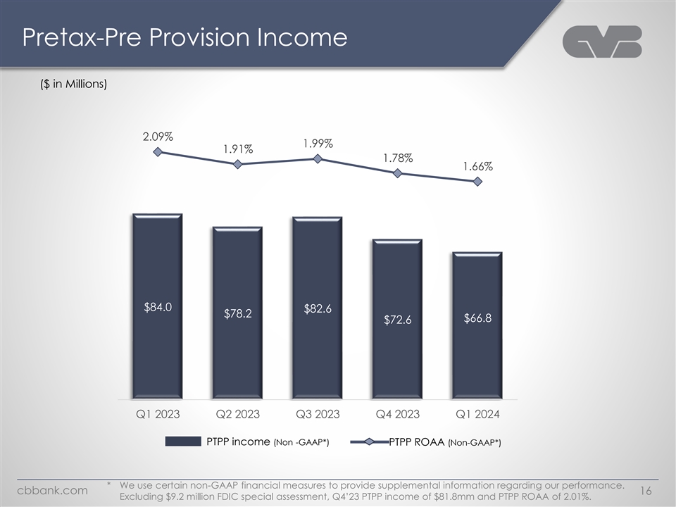 Reconciliation of PTPP Return on Average Assets (Non-GAAP) The Pretax-pre provision income (“PTPP”) return on average assets is a non-GAAP disclosure. We use certain non- GAAP financial measures to provide supplemental information regarding our performance. We believe that presenting the return on average tangible common equity provides additional clarity to the users of our financial statements. Year Ended December 31, Three Months Ended March 31, December 31, March 31, 2020 2021 2022 2023 2023 2023 2024 (Dollars in thousands) Net Income $ 1 77,159 $ 2 12,521 $ 2 35,425 $ 221,435 $ 59,270 $ 48,508 $ 48,599 Add: Provision for(recapture of) credit losses 23,500 (25,500) 10,600 2,000 1,500 ( 2,000) - Add: Income tax expense 72,361 85,127 92,922 93,999 23,279 26,081 18,204 Pretax-pre provision income $ 2 73,020 $ 2 72,148 $ 3 38,947 $ 317,434 $ 84,049 $ 72,589 $ 66,803 Average total assets $ 12,929,813 $ 15,350,521 $ 16,911,661 $ 16,346,172 $ 16,313,136 $ 16,169,125 $ 16,205,413 Return on average assets [1] 1.37% 1.38% 1.39% 1.35% 1.47% 1.19% 1.21% PTPP Return on average assets [1] 2.11% 1.77% 2.00% 1.94% 2.09% 1.78% 1.66% [1] Annualized where applicable. cbbank.com 58