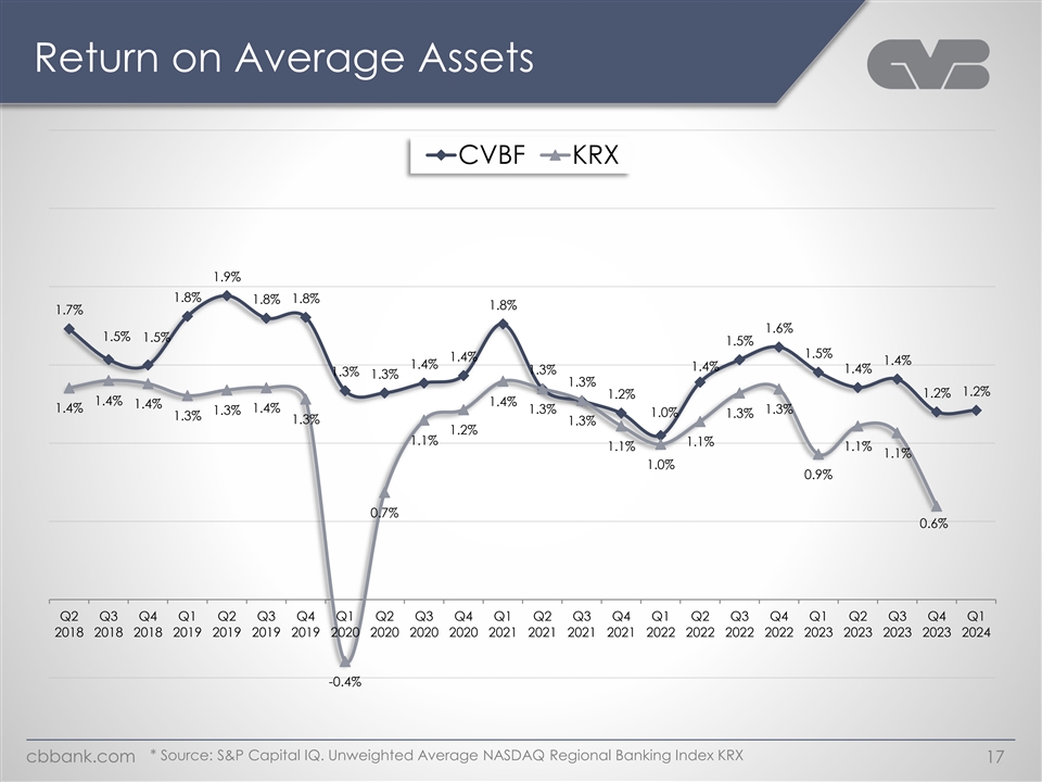 Return on Average Assets CVBF KRX 1.9% 1.8% 1.8% 1.8% 1.8% 1.7% 1.6% 1.5% 1.5% 1.5% 1.5% 1.4% 1.4% 1.4% 1.4% 1.4% 1.3% 1.3% 1.3% 1.3% 1.2% 1.2% 1.2% 1.4% 1.4% 1.4% 1.4% 1.4% 1.3% 1.3% 1.3% 1.0% 1.3% 1.3% 1.3% 1.3% 1.2% 1.1% 1.1% 1.1% 1.1% 1.1% 1.0% 0.9% 0.7% 0.6% Q2 Q3 Q4 Q1 Q2 Q3 Q4 Q1 Q2 Q3 Q4 Q1 Q2 Q3 Q4 Q1 Q2 Q3 Q4 Q1 Q2 Q3 Q4 Q1 2018 2018 2018 2019 2019 2019 2019 2020 2020 2020 2020 2021 2021 2021 2021 2022 2022 2022 2022 2023 2023 2023 2023 2024 -0.4% * Source: S&P Capital IQ. Unweighted Average NASDAQ Regional Banking Index KRX cbbank.com 17