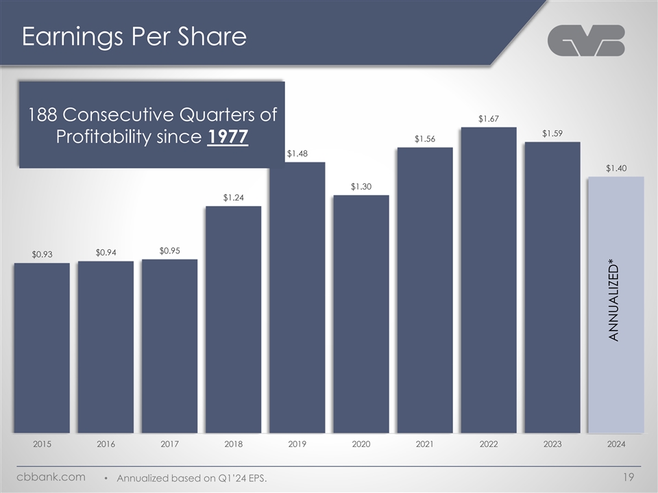 Dividends – 138 Consecutive Quarters 138 Consecutive Quarters $0.80 $0.80 $0.77 More than 30 years of cash $0.72 $0.72 $0.72 dividends since 1989 $0.56 $0.54 57.38% $0.48 $0.48 12/31/2015 12/31/2016 12/31/2017 12/31/2018 12/31/2019 12/31/2020 12/31/2021 12/31/2022 12/31/2023 3/31/2024 (ann.) Dividends per Share Dividend Payout Ratio cbbank.com 18 • Dividend payout ratio calculated on per share basis. Annualized based on YTD dividends/YTD net earnings ANNUALIZED*