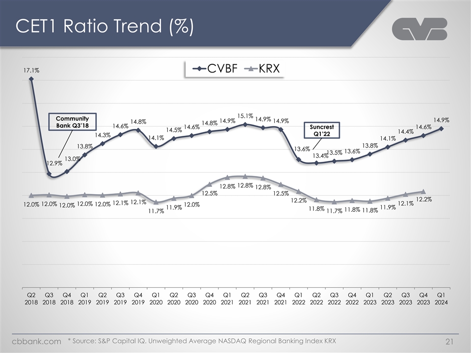 Strong Capital Ratios CVBF CET1 % KRX Avg CET1 % Regulatory Min. 14.9% 14.6% 14.4% 14.1% 13.8% 13.6% 13.6% 13.4% 13.5% 12.2% 12.1% 12.2% 11.8% 11.9% 11.8% 11.8% 11.7% 7.0% 7.0% 7.0% 7.0% 7.0% 7.0% 7.0% 7.0% 7.0% Q1 2022 Q2 2022 Q3 2022 Q4 2022 Q1 2023 Q2 2023 Q3 2023 Q4 2023 Q1 2024 Capital Ratios 15.8% 14.9% 14.9% As of Q1 2024 5.3% 10.5% 6.4% $581mm 7.9% $877mm $711mm 6.5% $1B 10.5% 8.5% 7.0% 4.0% T1 Leverage CET1 T1 RBC Total RBC Regulatory Minimum + Capital Conservation Buffer Excess Capital * Source: S&P Capital IQ. Unweighted Average NASDAQ Regional Banking Index KRX (50 Banks) cbbank.com 20